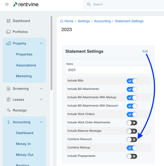- If you would like the discount to show on the owner statement, you will need to go to the owner statement profile you have set up for the portfolio. You can get here by going to Settings/Statements and then clicking on the specific owner statement profile you want to edit. In the top statement settings box, click the edit button. Make sure the toggle for Combine Discount is turned off.
