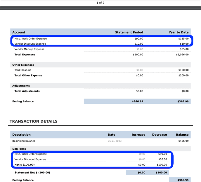 - This will make it so that on the statement, the owner will see two line items for each of the bills that were actually created. One will show an expense paying the vendor, and the second will show a bill paying for the vendor discount expense. Please see below for an example.