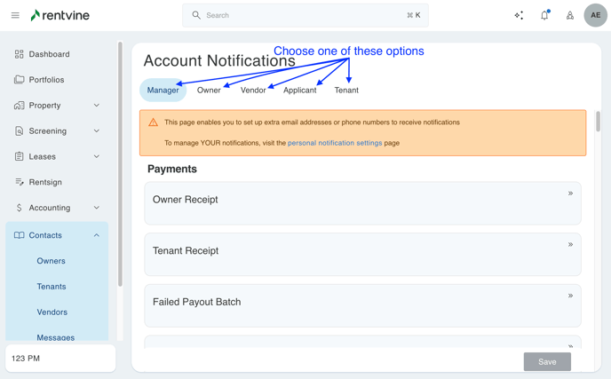- Once you have selected one of the tabs, you can then select the notification(s) that you want to configure. For example, if you want to configure extra users to get notified when a Tenant Payment is received: