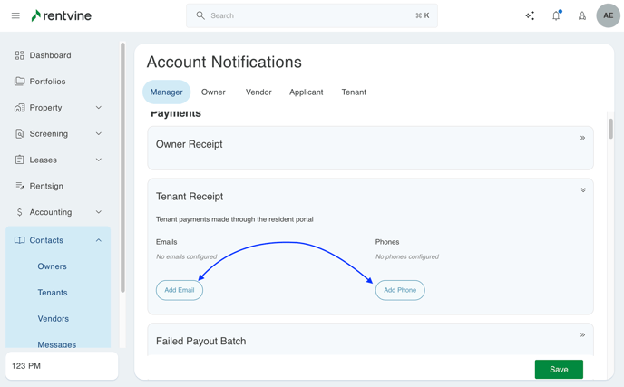 Alerts contacts outside of your Rentvine users when certain actions or events occur in your Rentvine account.