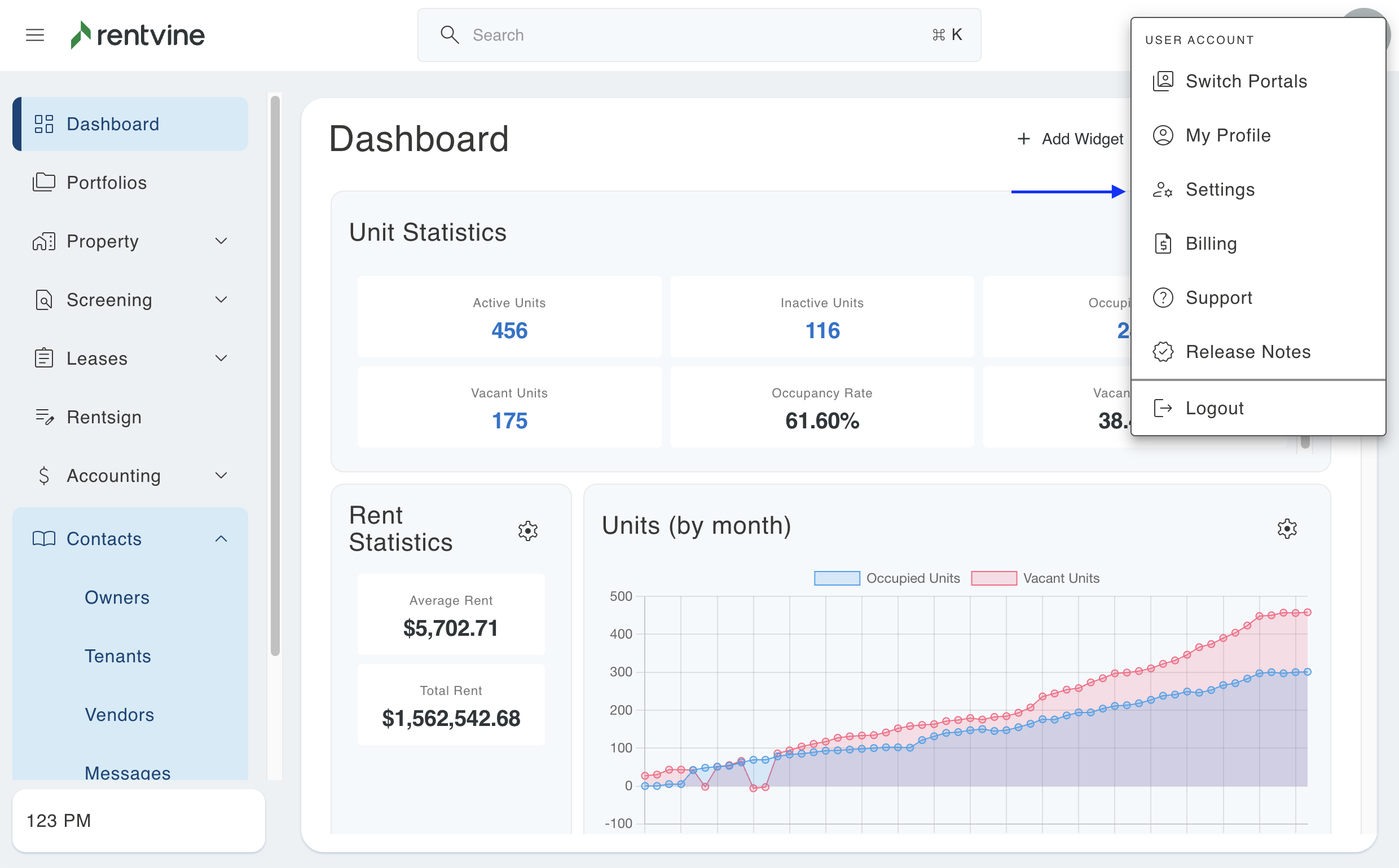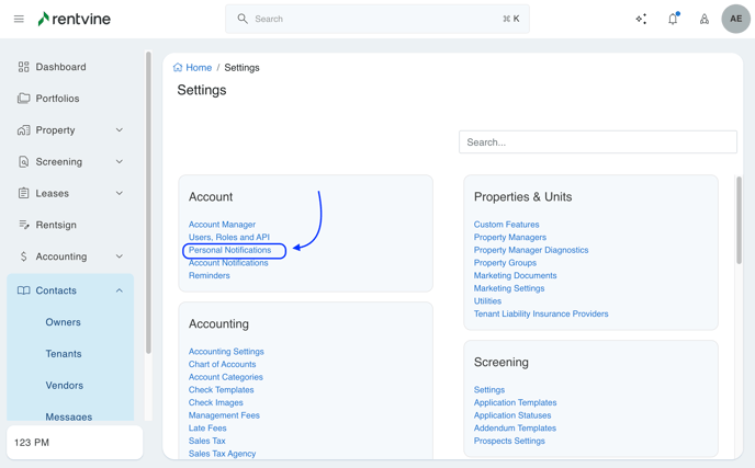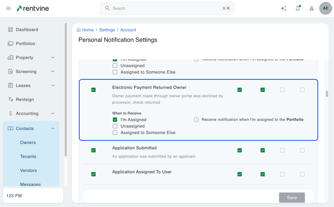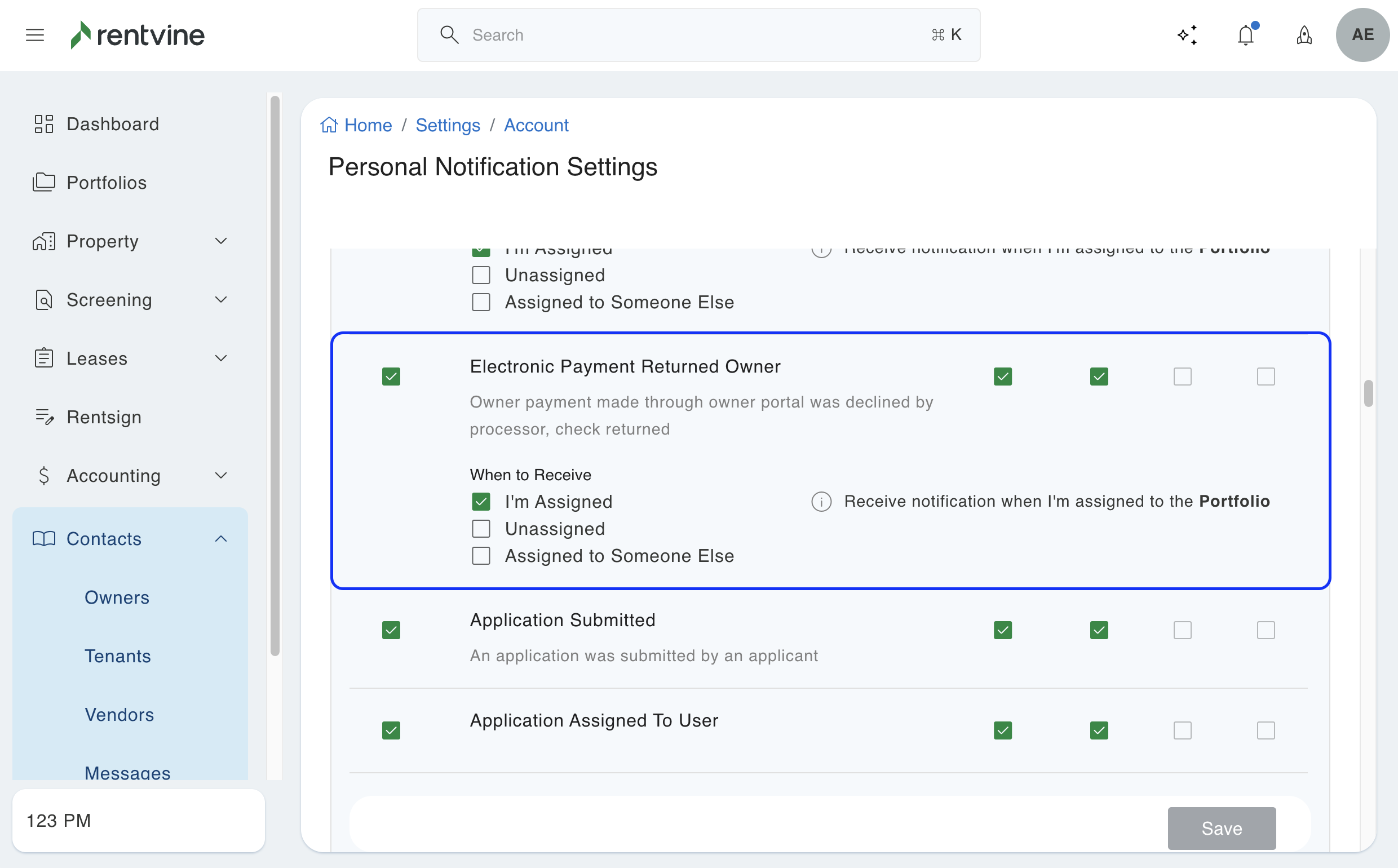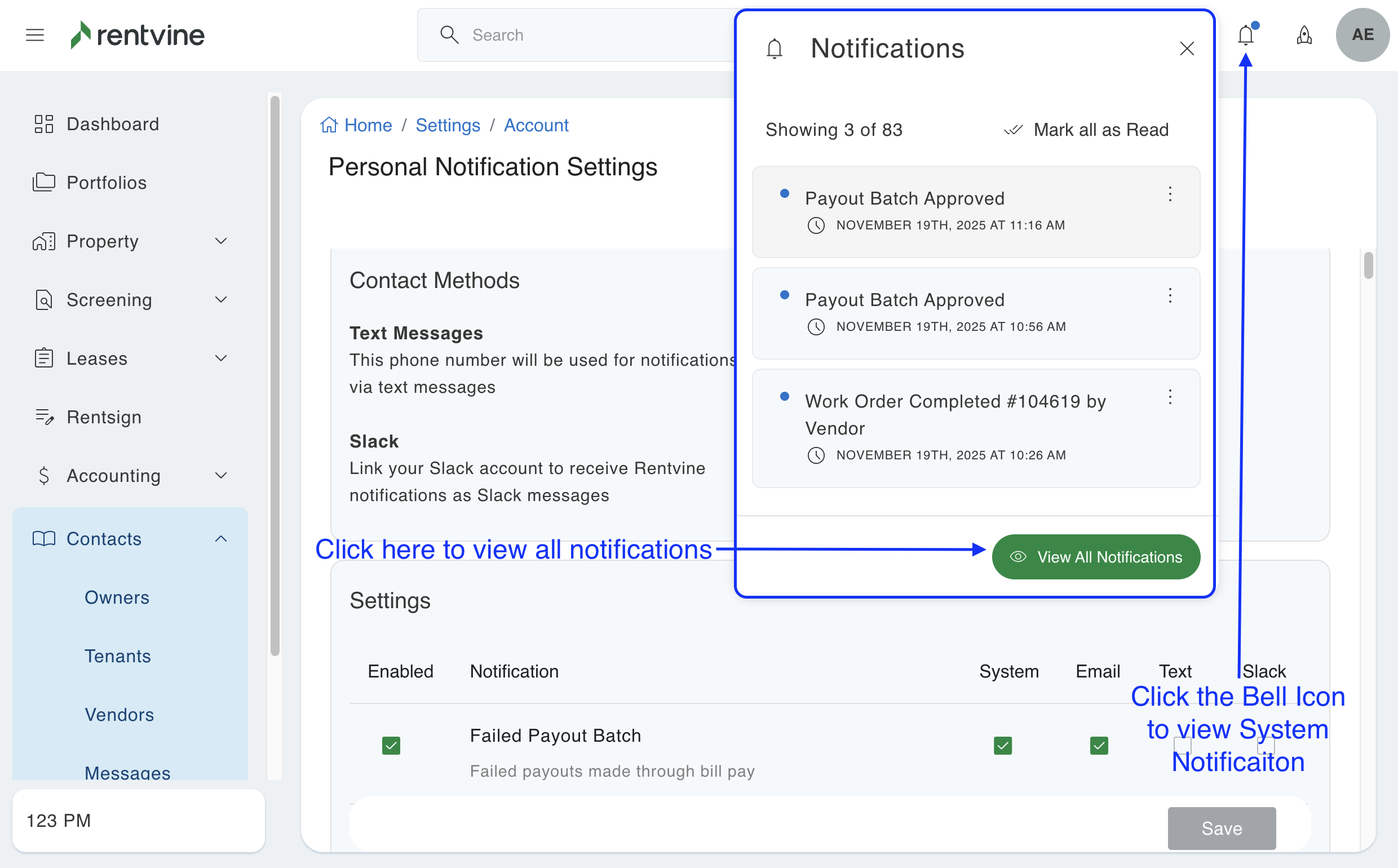 - System- this will be added to the notifications tab internally within Rentvine. You can view these by clicking the bell icon in the top left of your account.