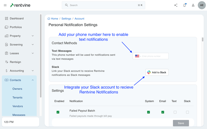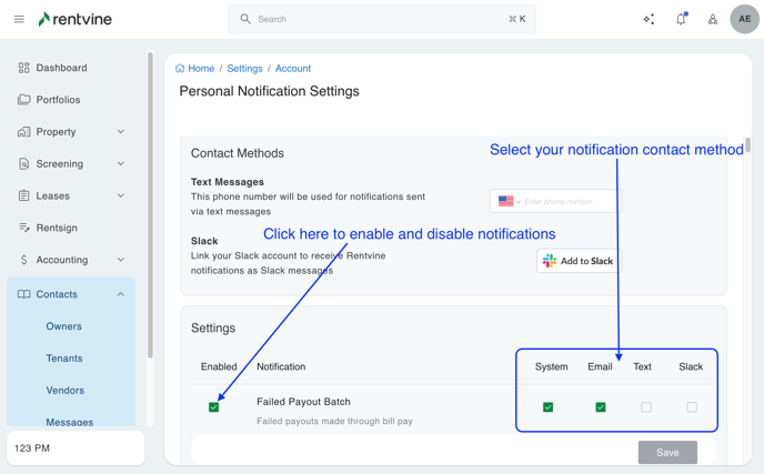 - Email- a notification will be sent to the email you used to register your Rentvine account.