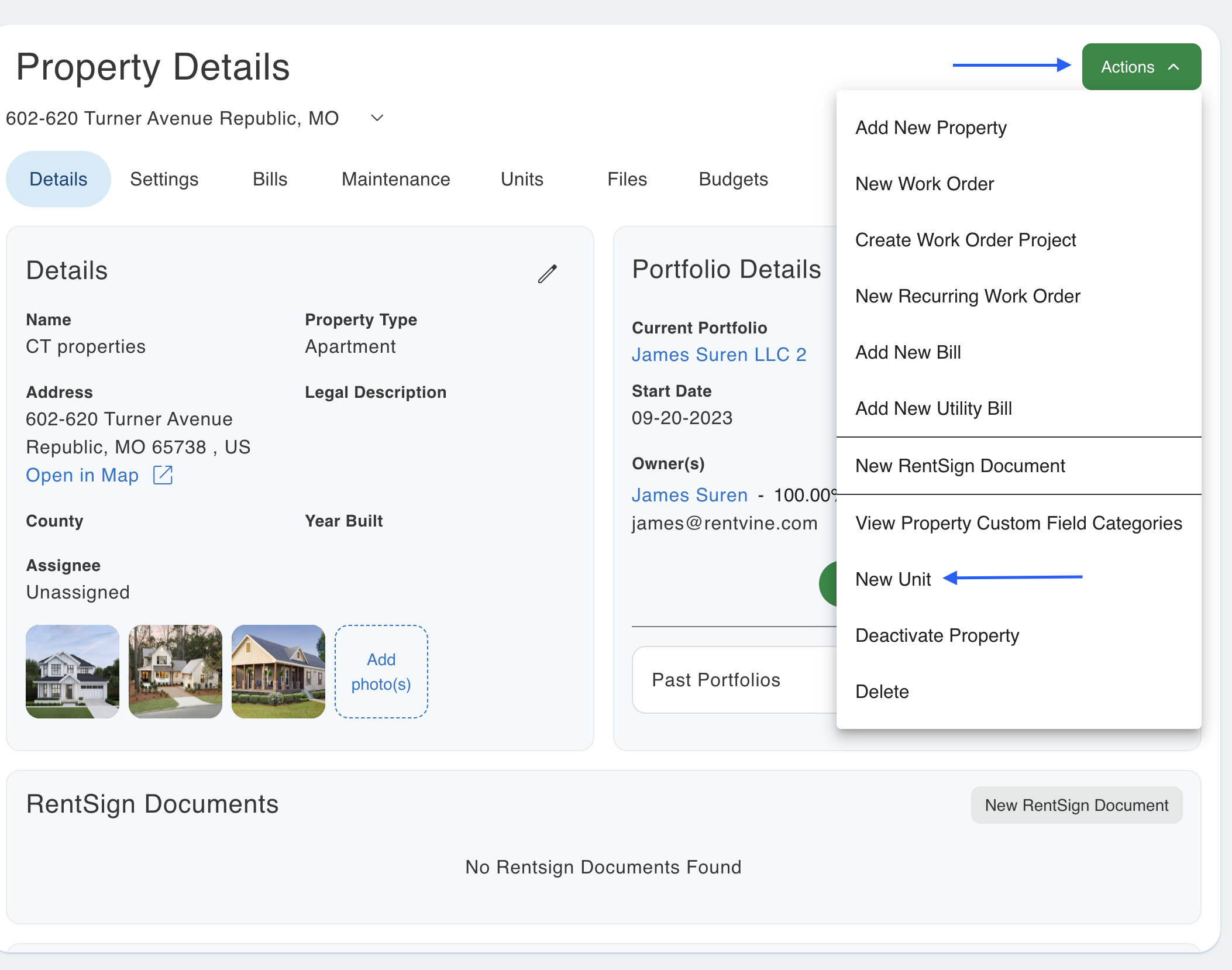After the property is recreated and saved, select Actions, New Unit. Add unit information and Save, or save and Add Another.