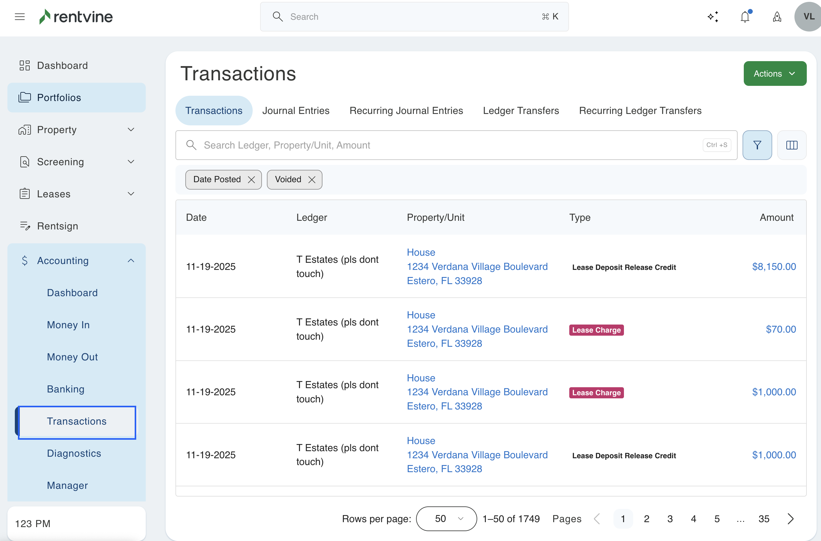 Once the unpaid charges are transferred over, on the old lease account page, void those charges by selecting Transactions, and select the amount that was transferred over.
