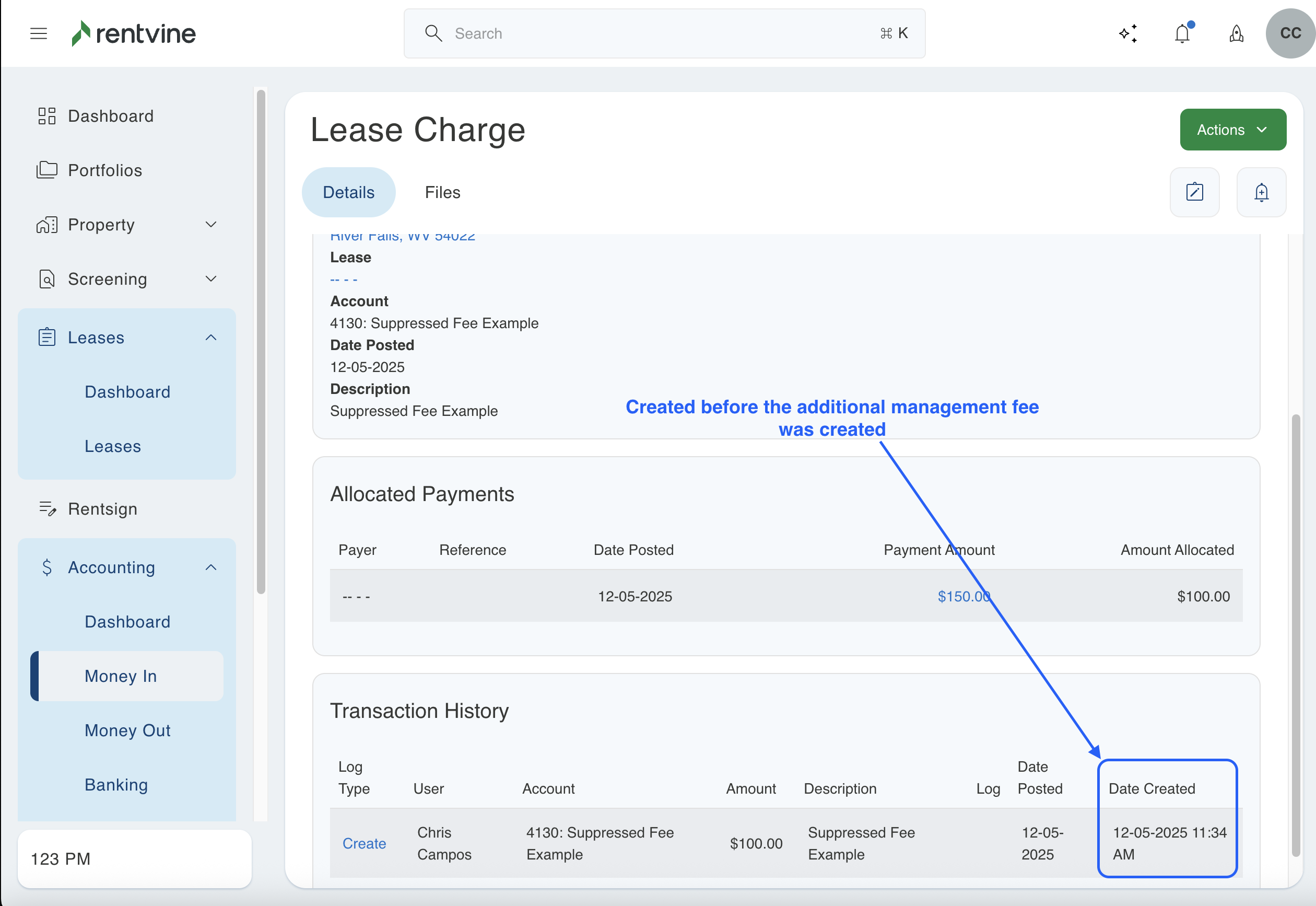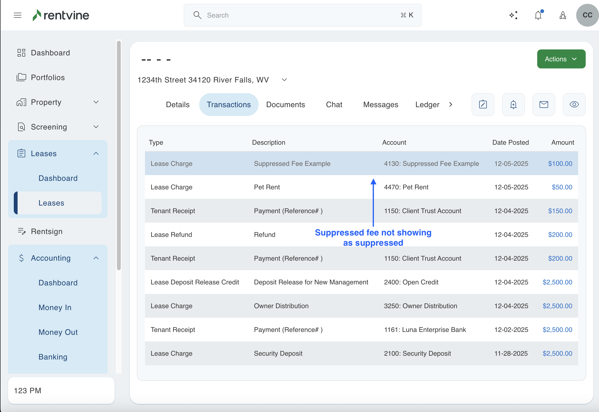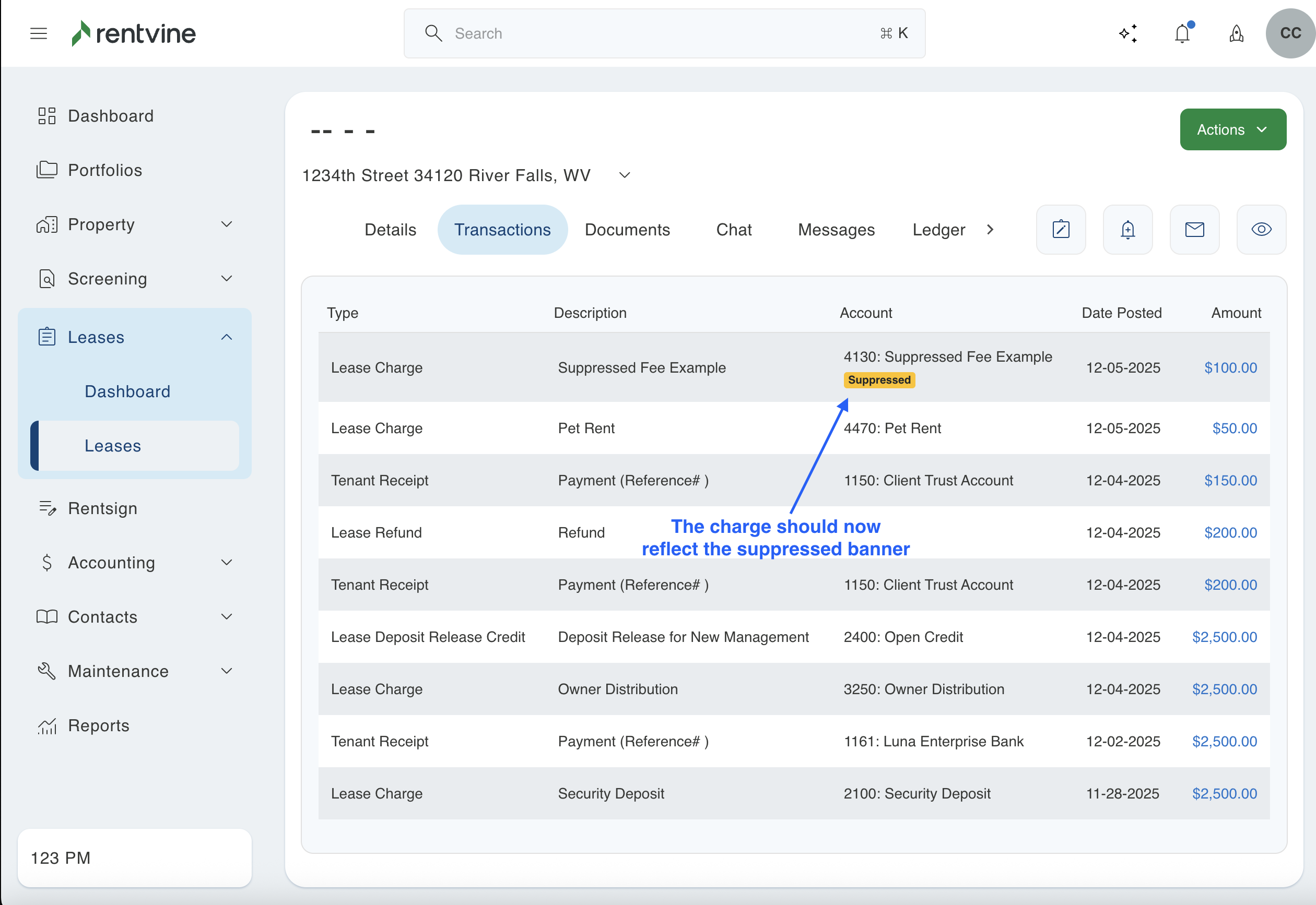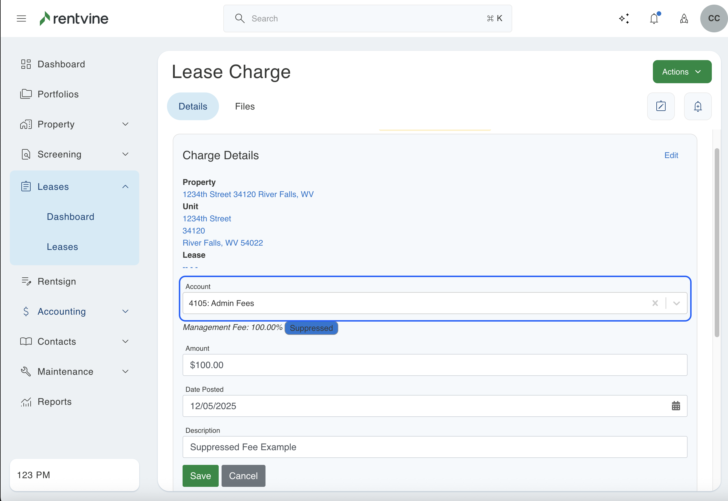 This will occur when a charge is added to a lease using a certain chart of account. This will not be suppressed if it has not been added as an additional management fee. Even if you add this as a suppressed fee later in this section, the system does not backdate charges. If a charge was previously created using that chart of account, it will not automatically show as a suppressed fee. Below is an example where the charge was created before the management fee was added. If this is what you see in your system, then this article will walk you through updating those older charges that are not showing as suppressed.