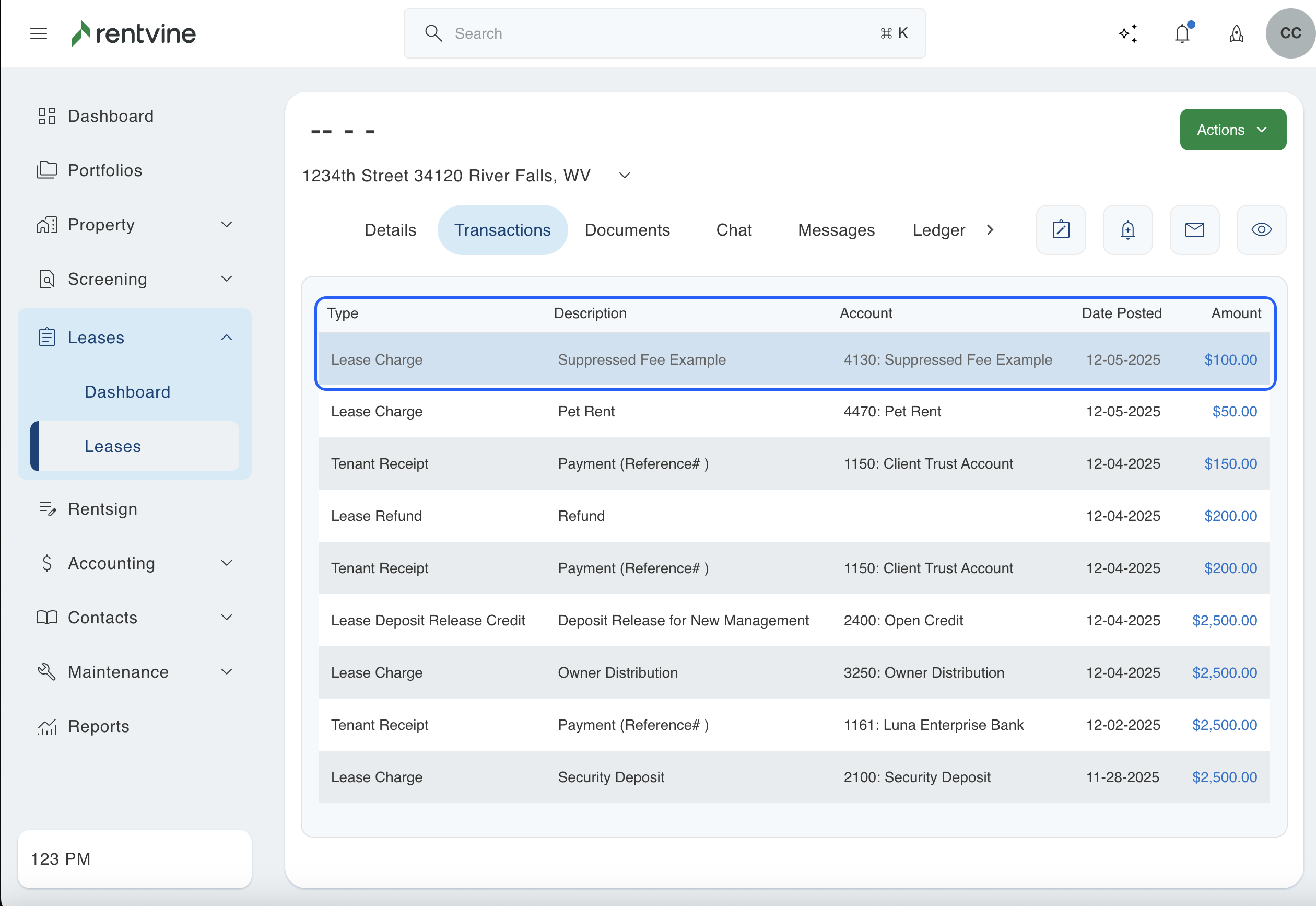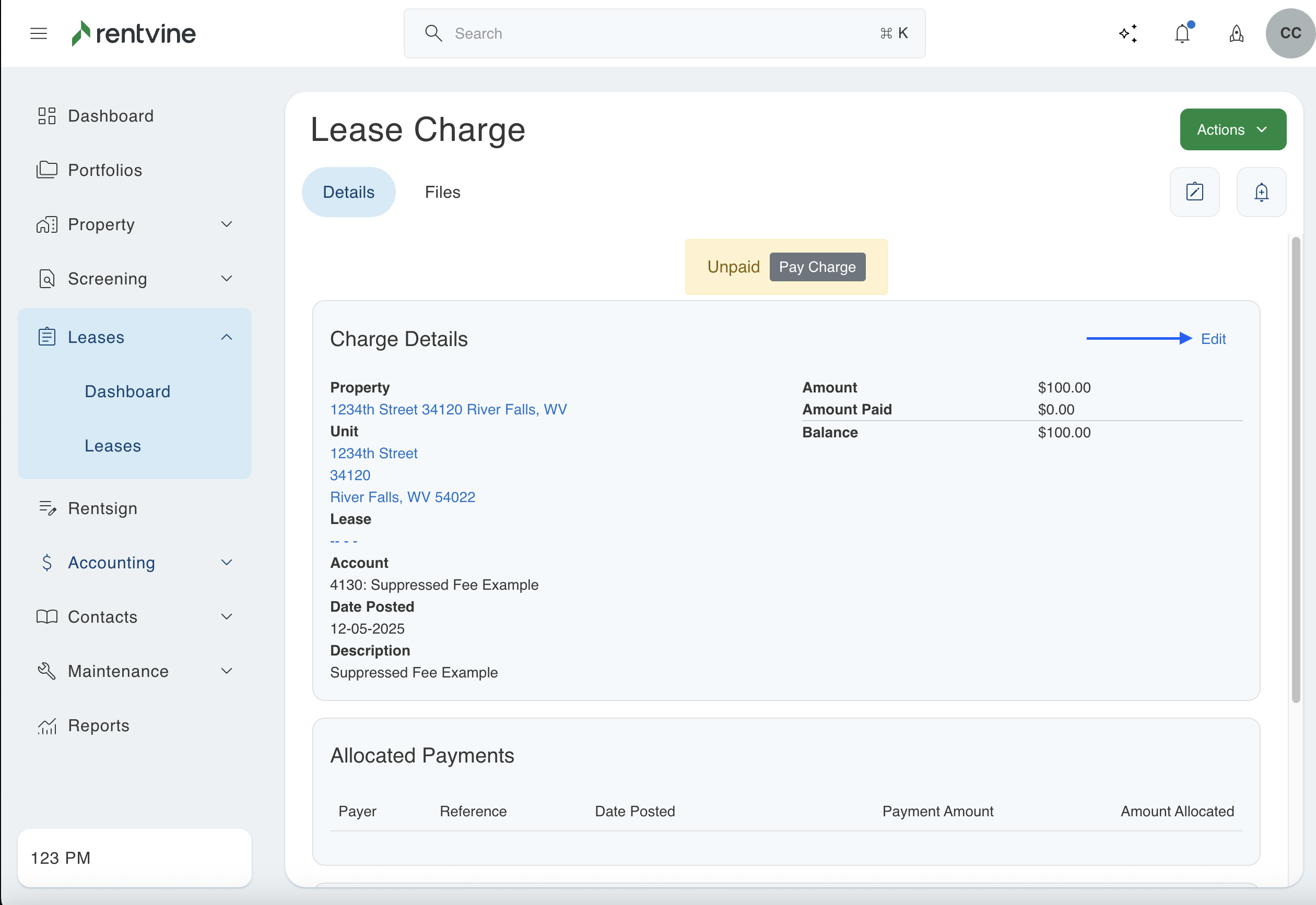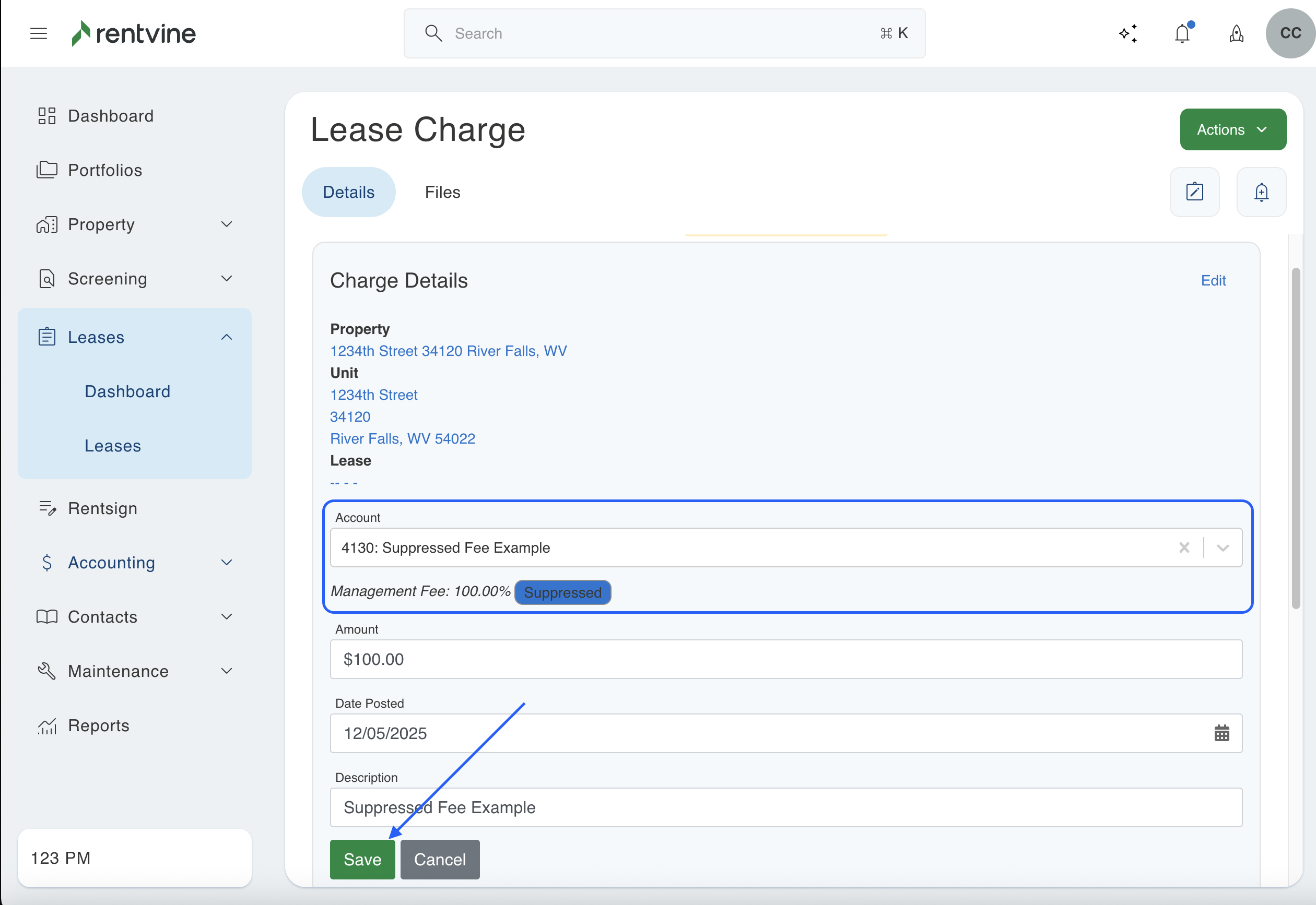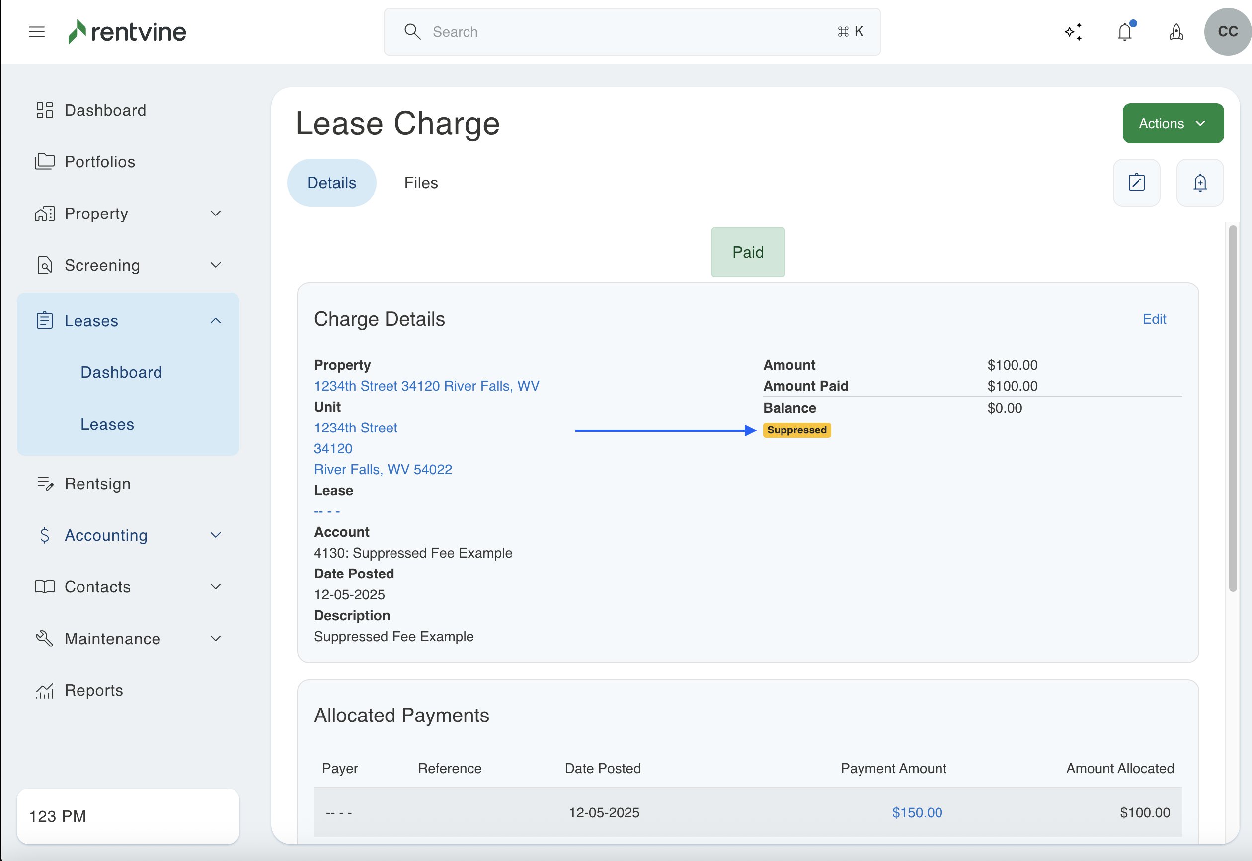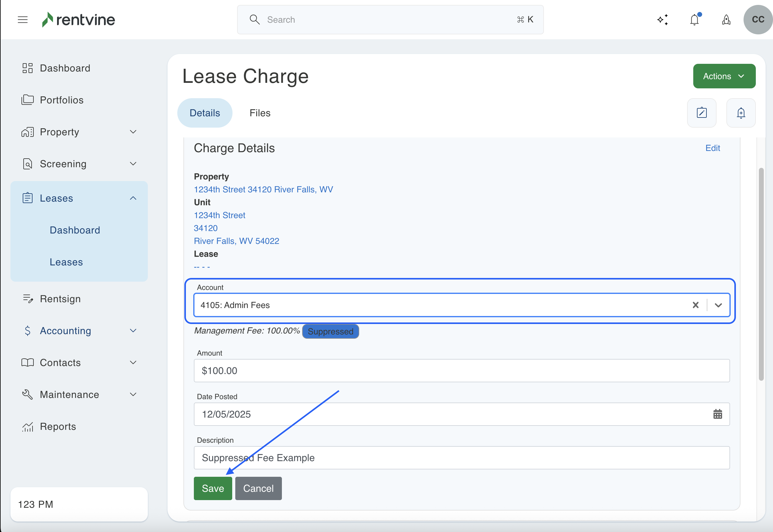 This will occur when a charge is added to a lease using a certain chart of account. This will not be suppressed if it has not been added as an additional management fee. Even if you add this as a suppressed fee later in this section, the system does not backdate charges. If a charge was previously created using that chart of account, it will not automatically show as a suppressed fee. Below is an example where the charge was created before the management fee was added. If this is what you see in your system, then this article will walk you through updating those older charges that are not showing as suppressed.