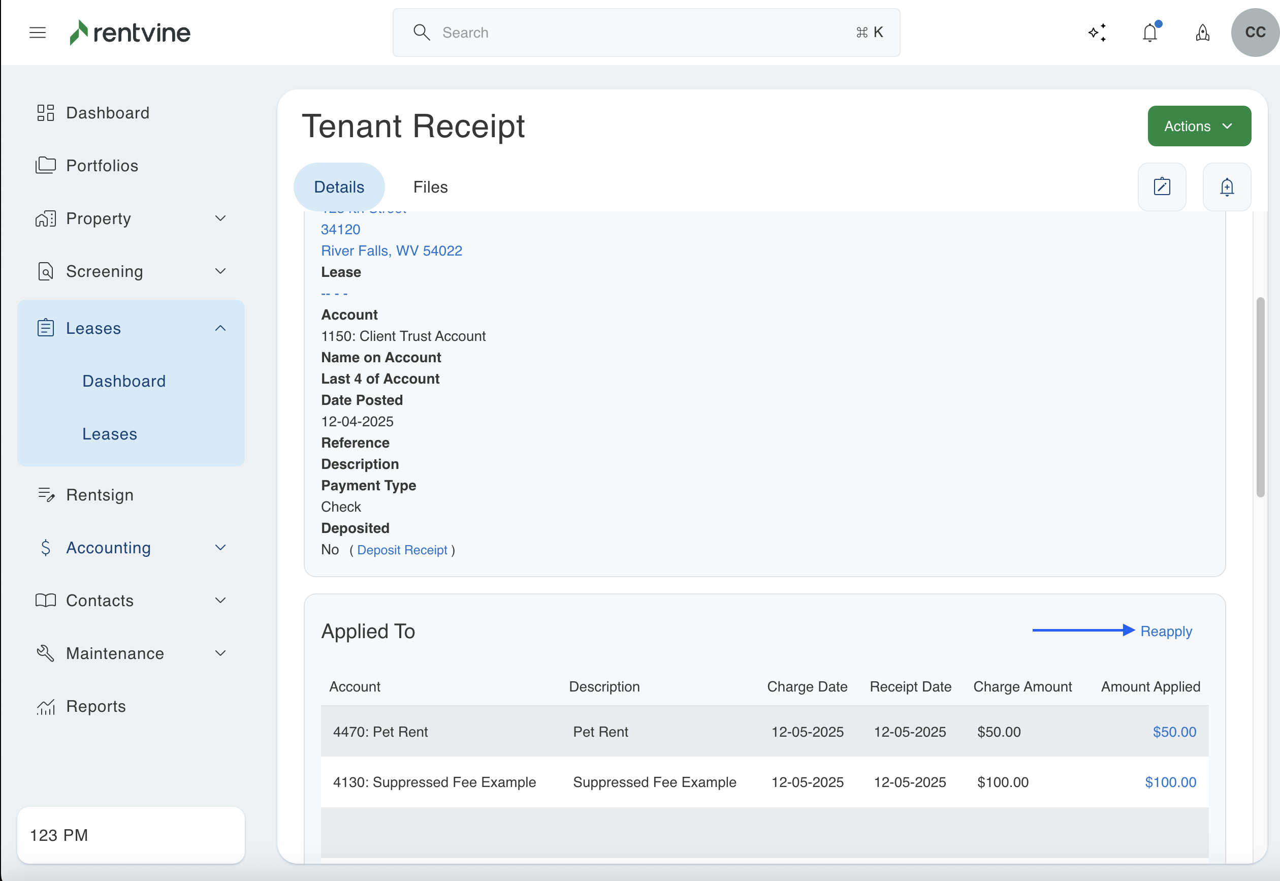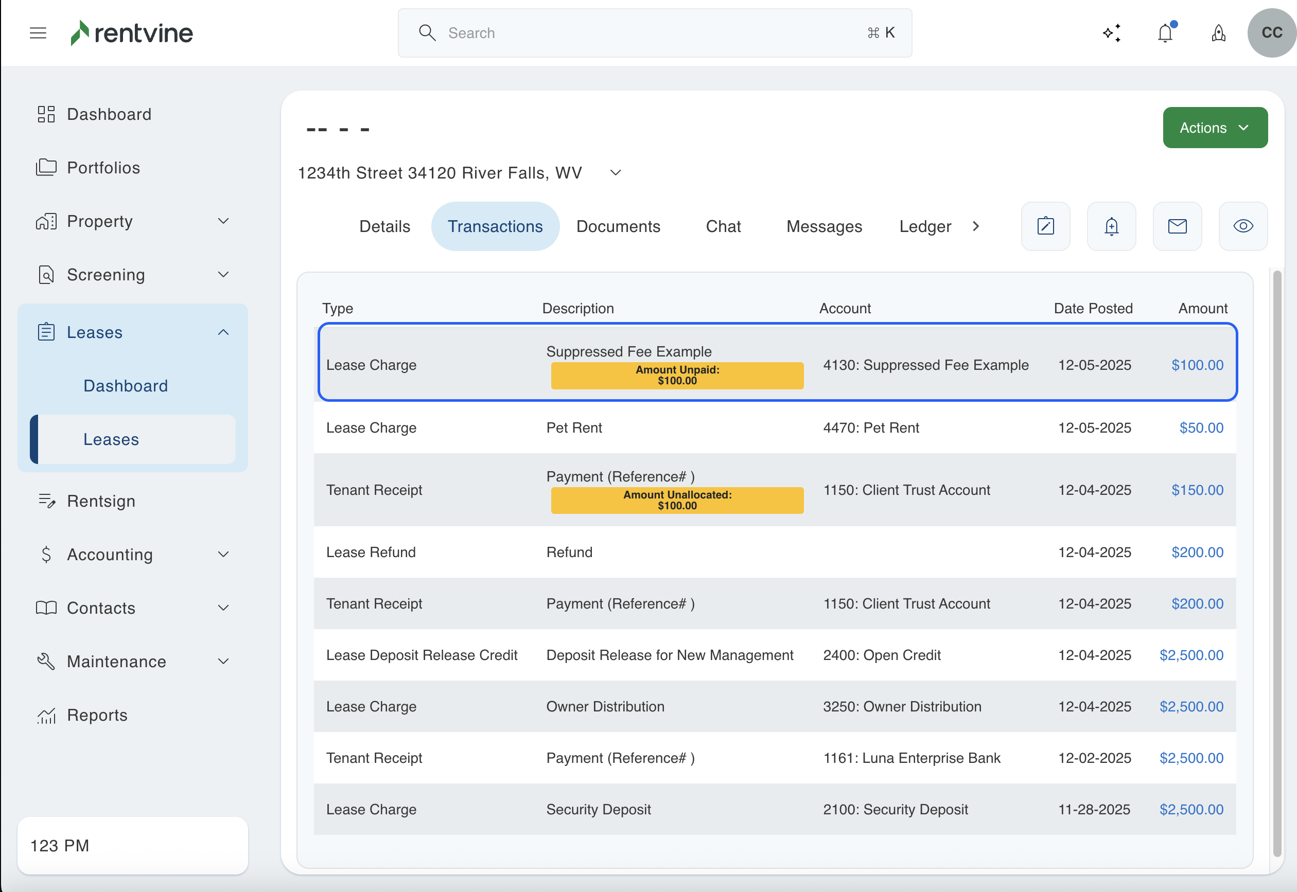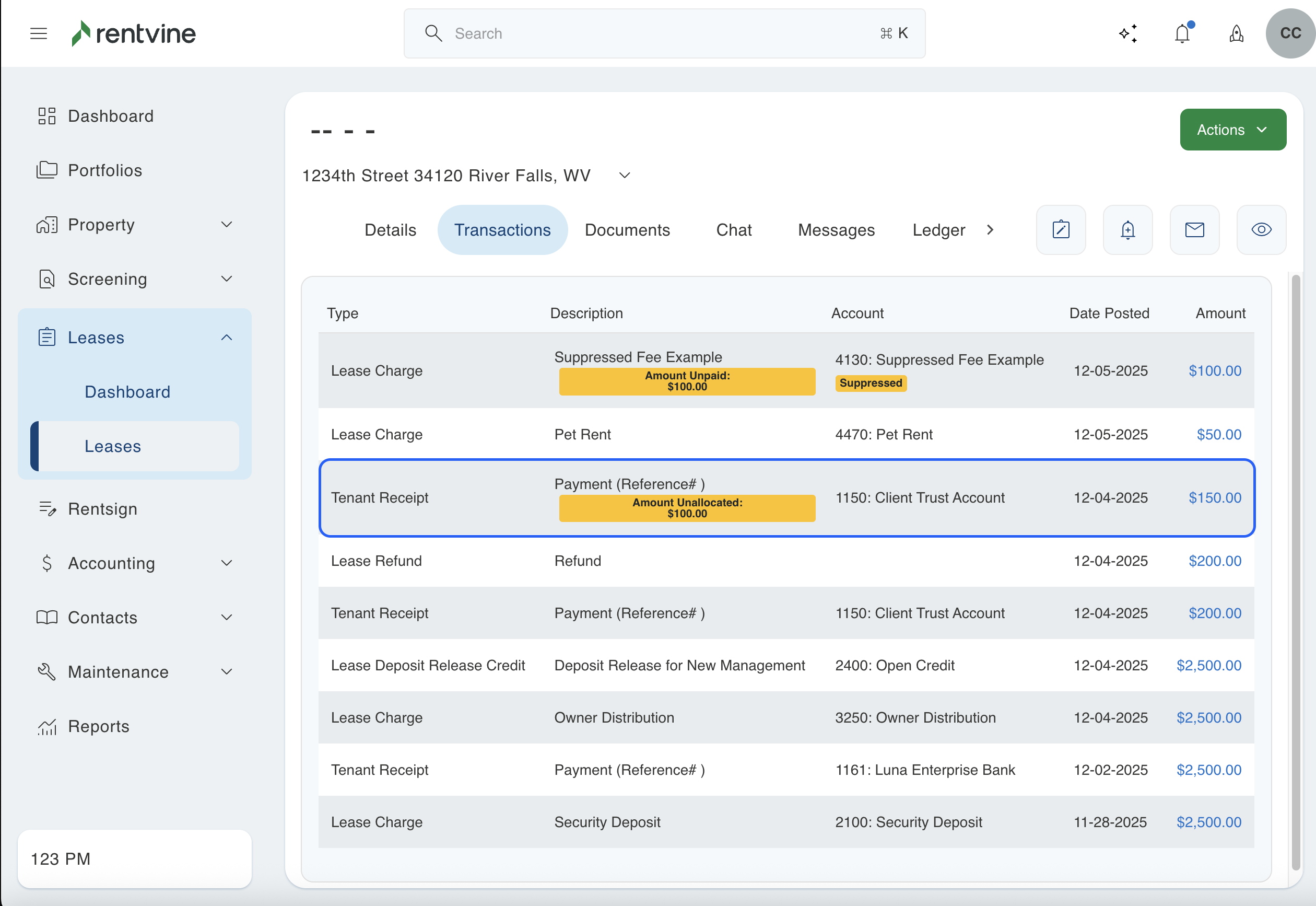 - To start, you will need to go to the lease where this situation occurred. You can then click on the transactions tab to view all of the charges and receipts associated with this lease.