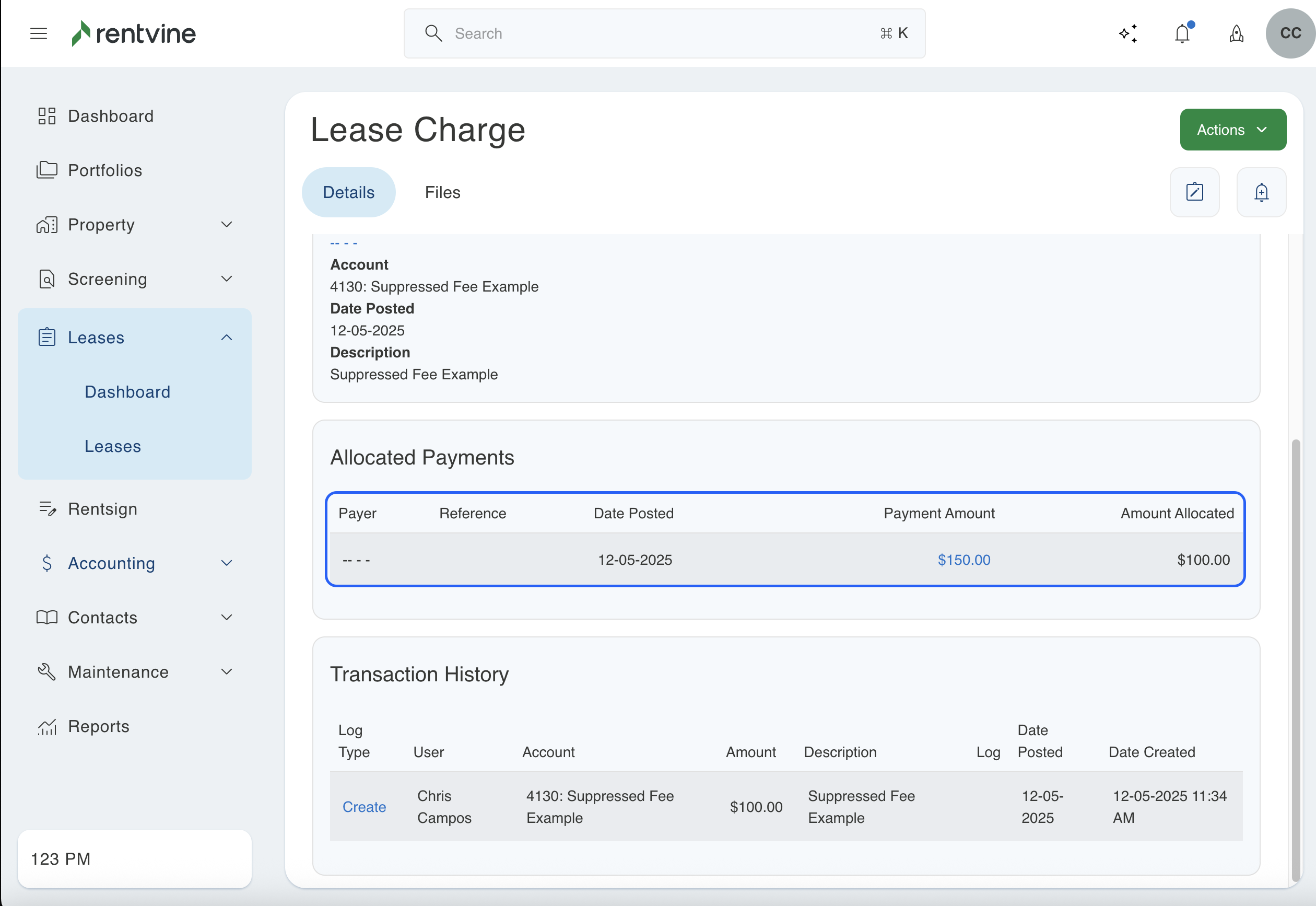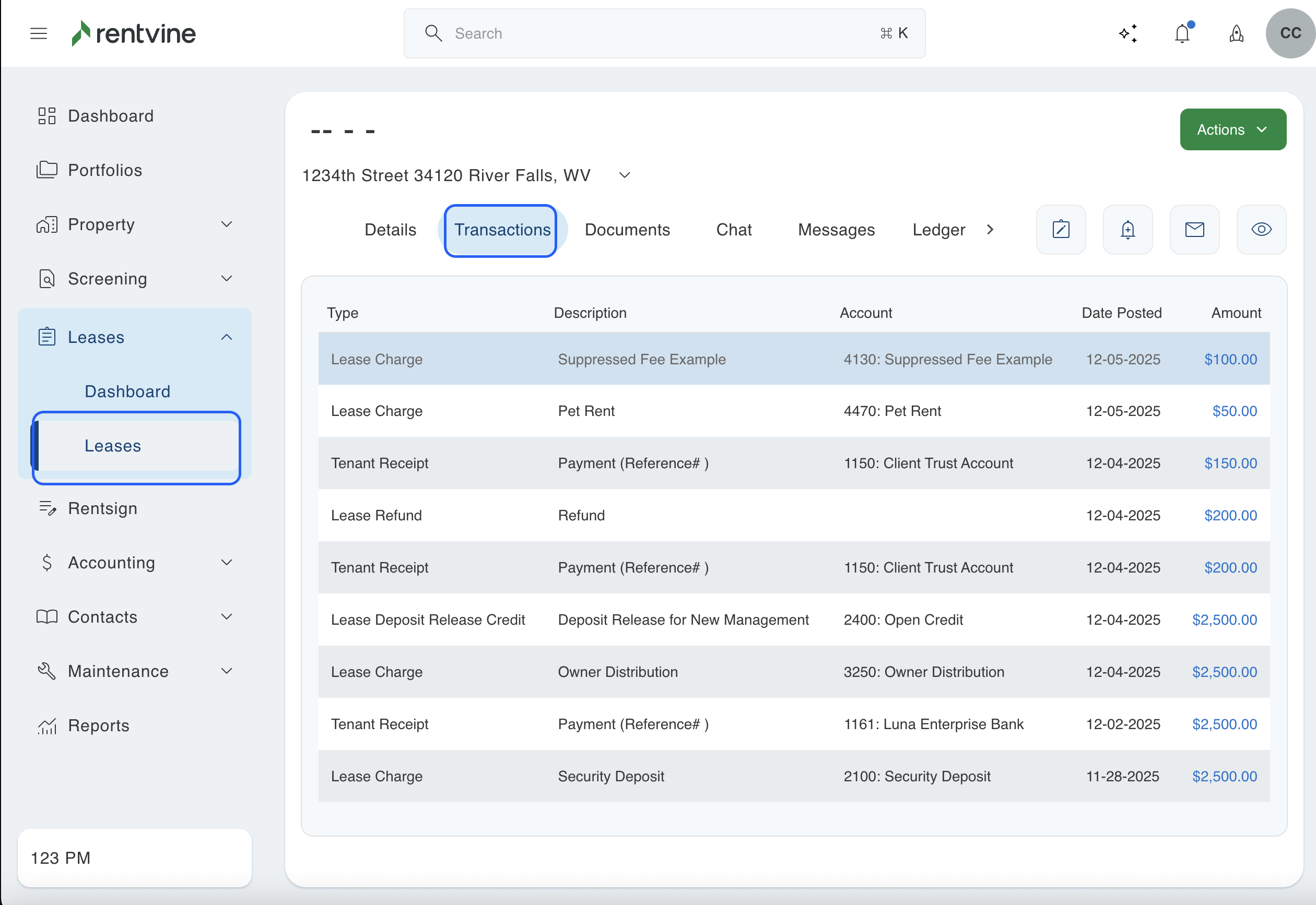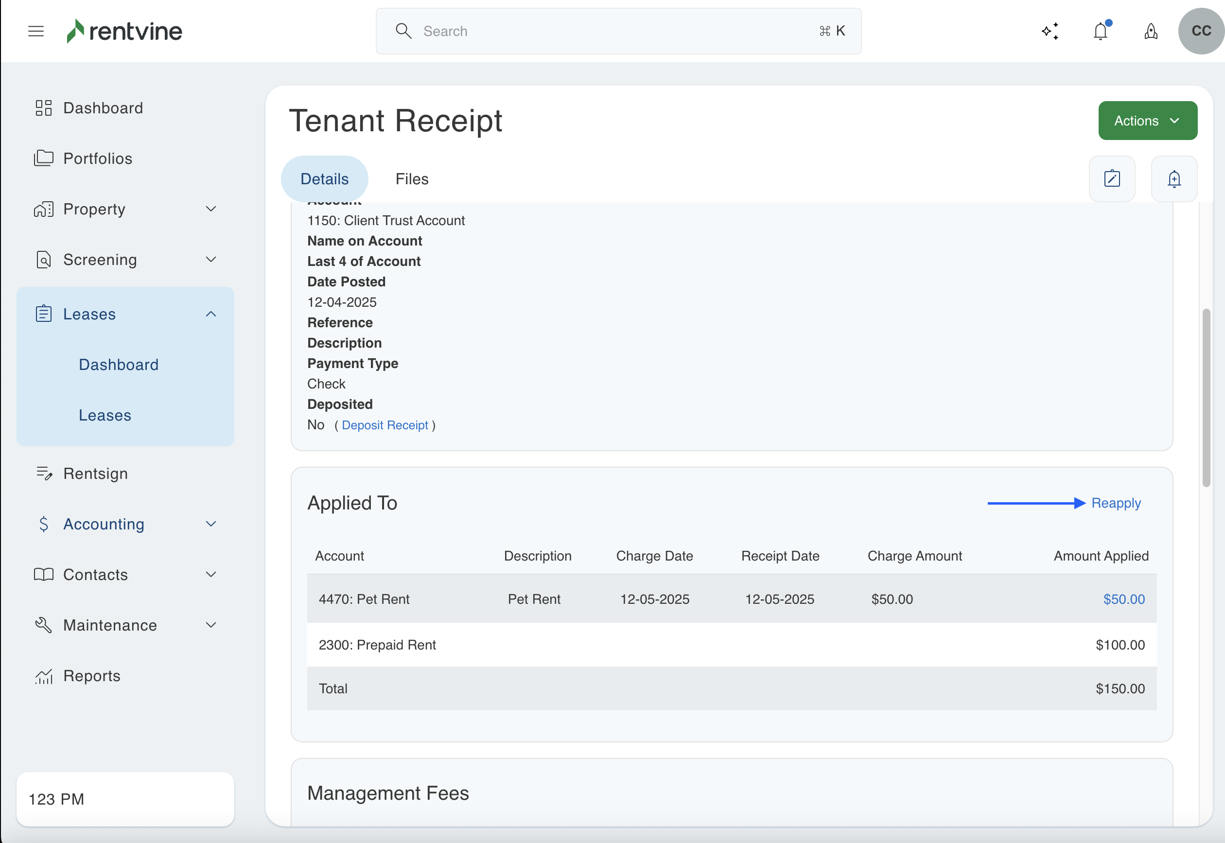 - To start, you will need to go to the lease where this situation occurred. You can then click on the transactions tab to view all of the charges and receipts associated with this lease.