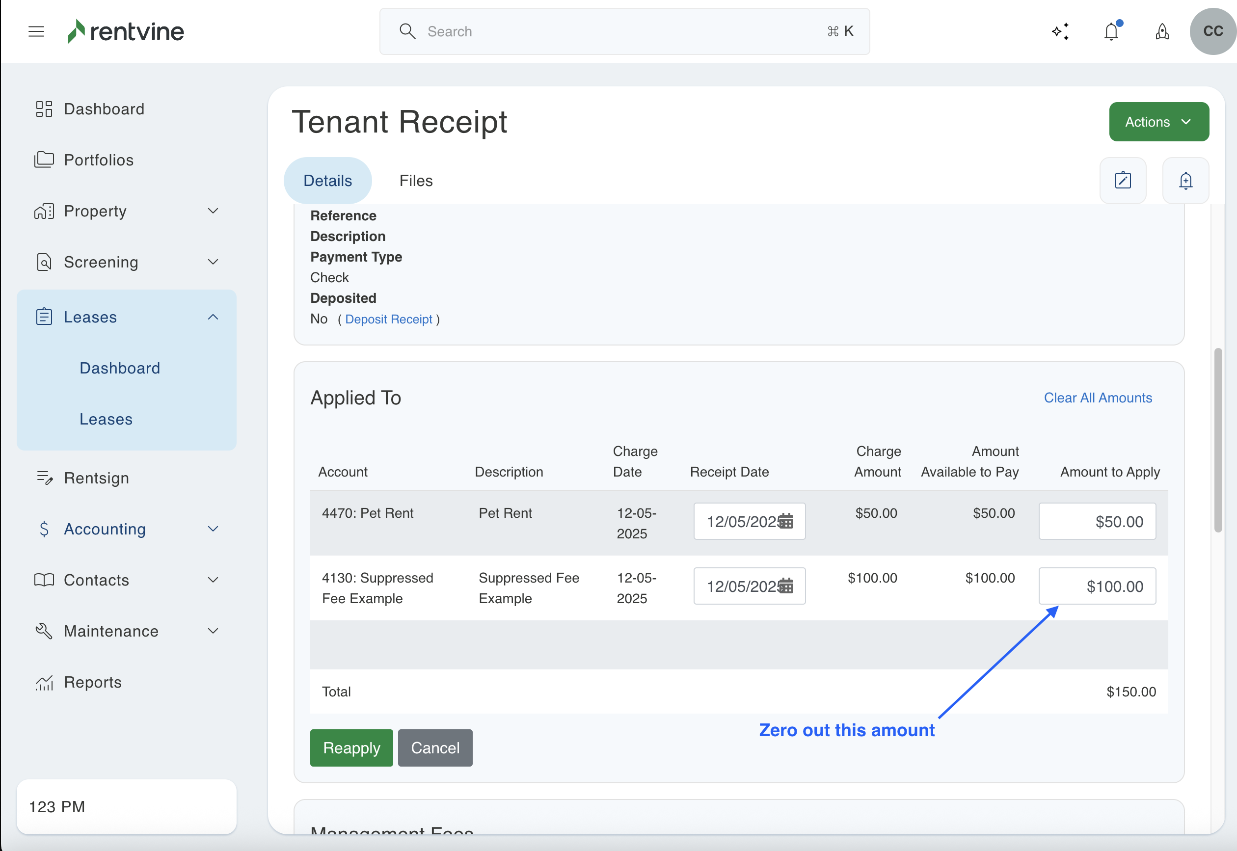 - Since the charge that needs to be changed has a receipt allocated, we will need to zero out that amount. To do this, look for the charge and erase the current amount applied. You will then need to enter $0.00 in here and click the green "Reapply" button to save this.