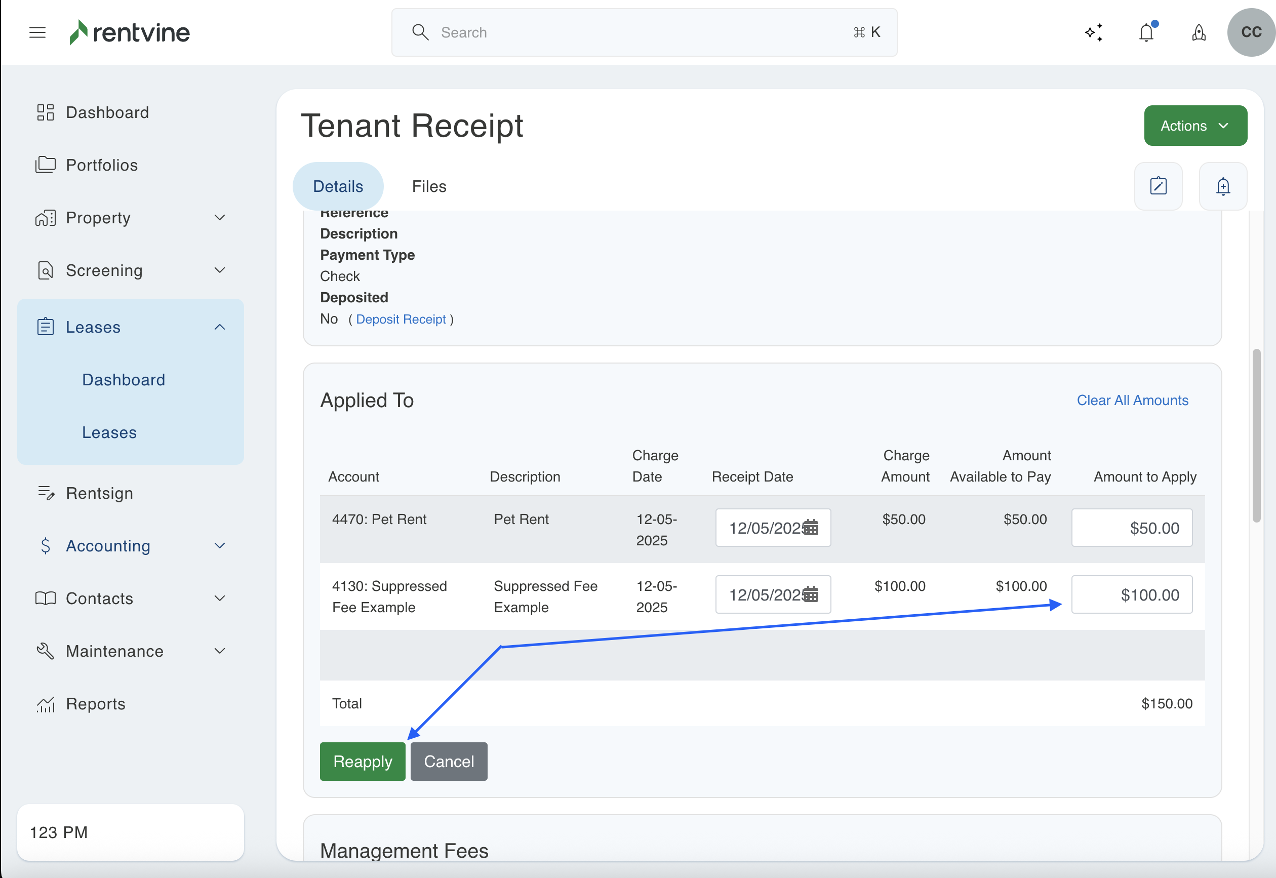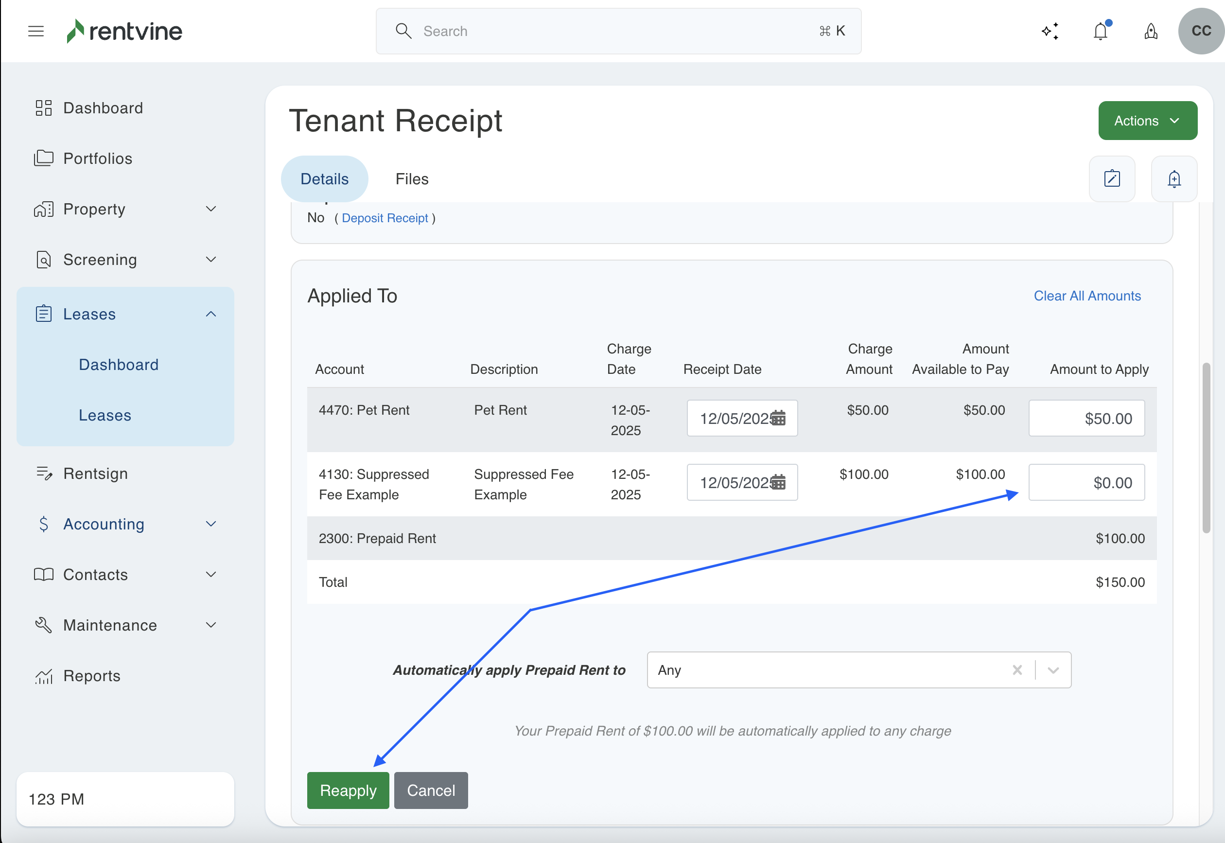 - Scroll down to the "Applied To" section and click the reapply button. You will then need to enter the amount you want the receipt to allocate for this charge. Make sure to click the green "Reapply" button to save this allocation.