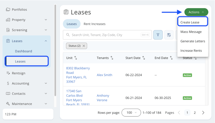 - Click the Green Actions Menu and Choose CREATE LEASE