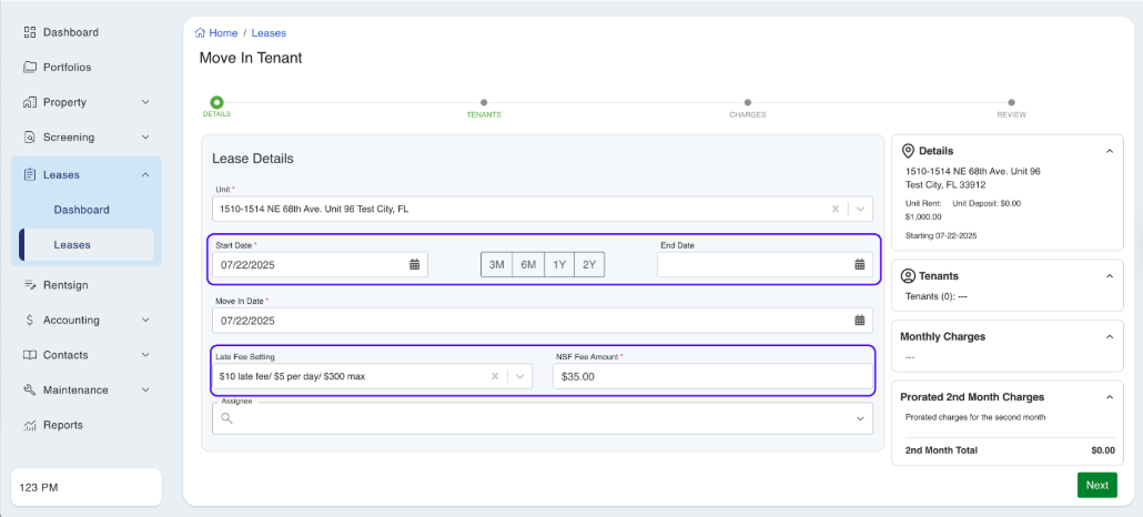 - In the lease details page, you would add the unit info along with selecting the start and end dates of the lease, along with the move-in date. You can add your late fee settings/rent amount/NSF Fee amount below. You can also select an assignee for a user who needs to receive all notifications regarding this lease.