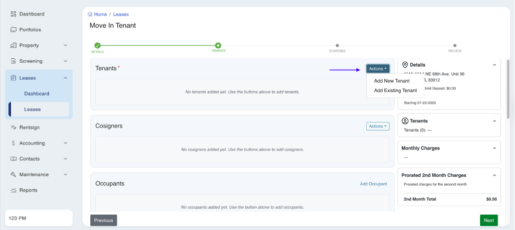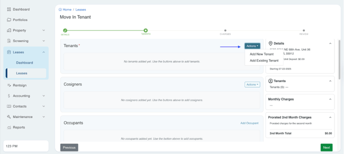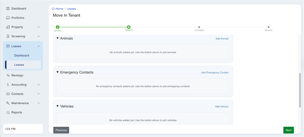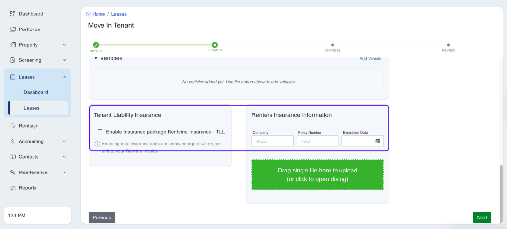 - Under the Tenants page, you will add New Tenants or Existing Tenants. Existing tenants will be pulled from your list of tenant contacts already created in the system. Adding a new tenant will allow you to create a new tenant contact. Along with this, you can add any occupants, cosigners, animals, emergency contacts, and vehicles that will also be associated with this lease. Under this, there is a section for tenant liability insurance and renters insurance information if needed as well. Please note that if you do not have the tenant's renters' insurance, then they can upload it within their portal.