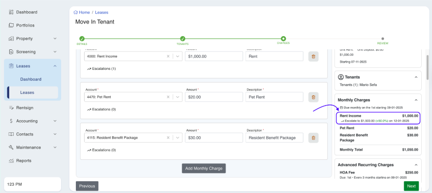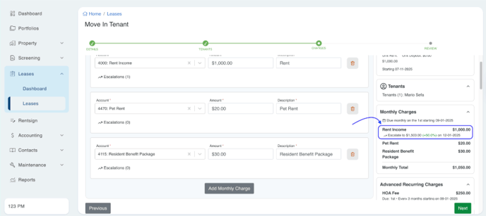 On the Charges screen, first, you will see the Monthly Charges. These will always be due on the first of the month, and you can now add Escalations to the Monthly Charges.