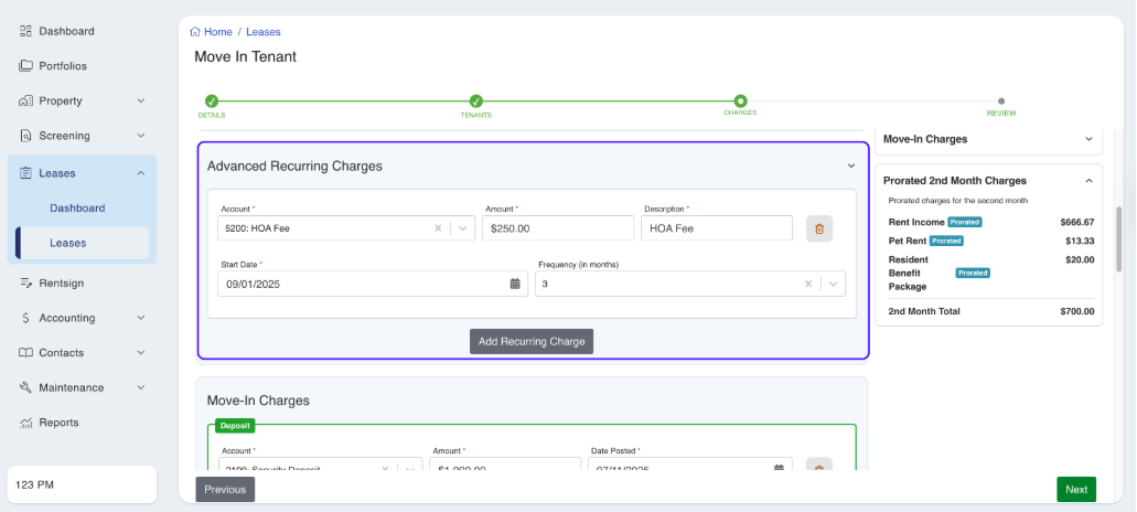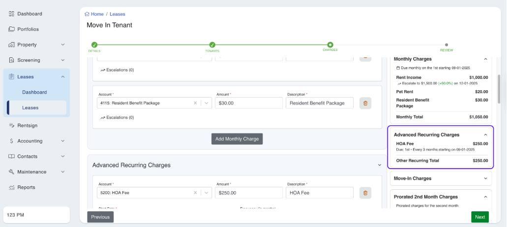 Next, you will see the Advanced Recurring Charges. These can be something that is billed to the tenants that is not as frequent as a Monthly Charge. For example, if you were to bill your tenants an HOA Fee quarterly, you can add those charges here.