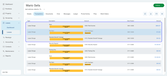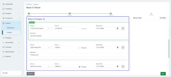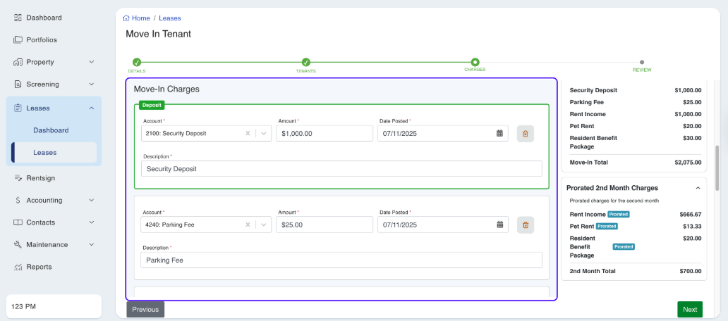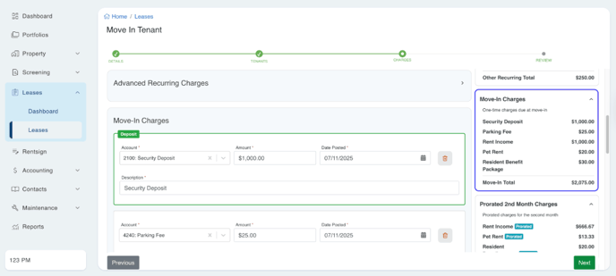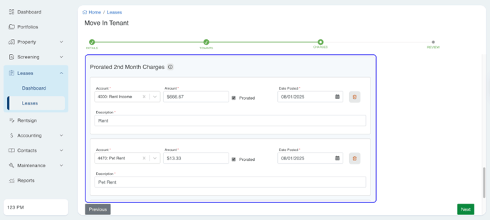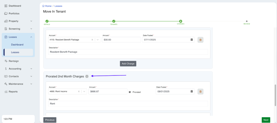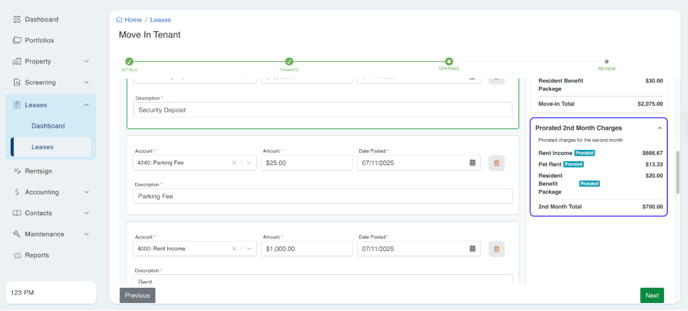 Depending on the settings you have for the Move In Proration, you can also see the last section labeled Prorated 2nd Month Charges.