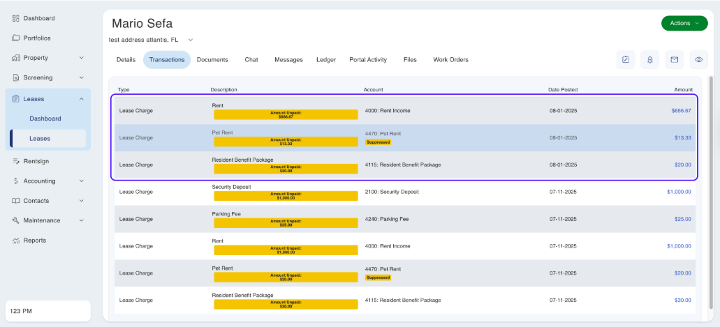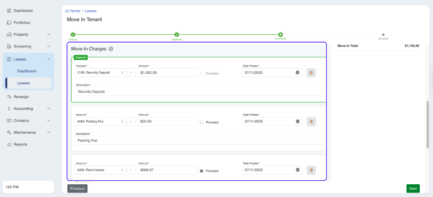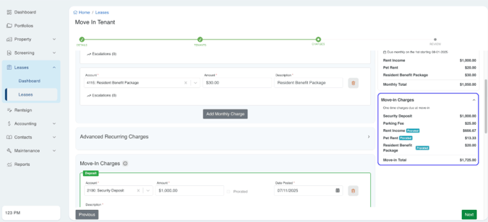 Next, you will see the Move In Charges, which will pull the information of both the Default Monthly Charges and the Default Move In Charges.