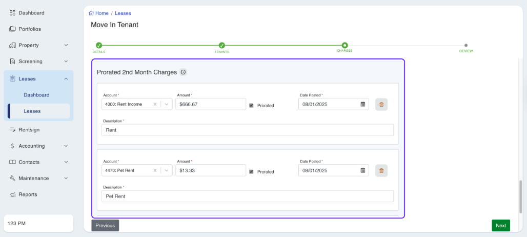 This section will be the Rent Charge, along with the Default Monthly Charges , and will prorate the charges for the second month of the lease