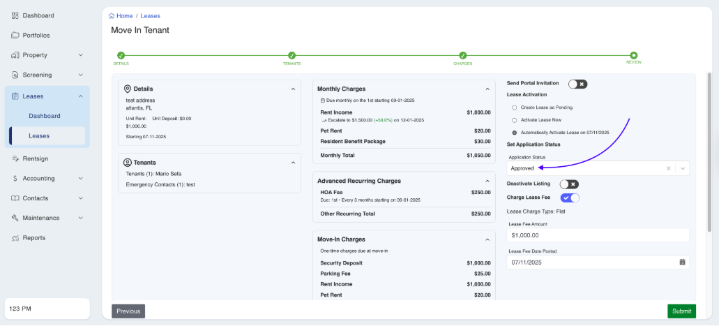 Lastly, you can instantly send "Portal Invitations", and choose to "Activate" the lease and "Charge Lease Fee" to the owner from this final review page by simply using the toggle buttons.
