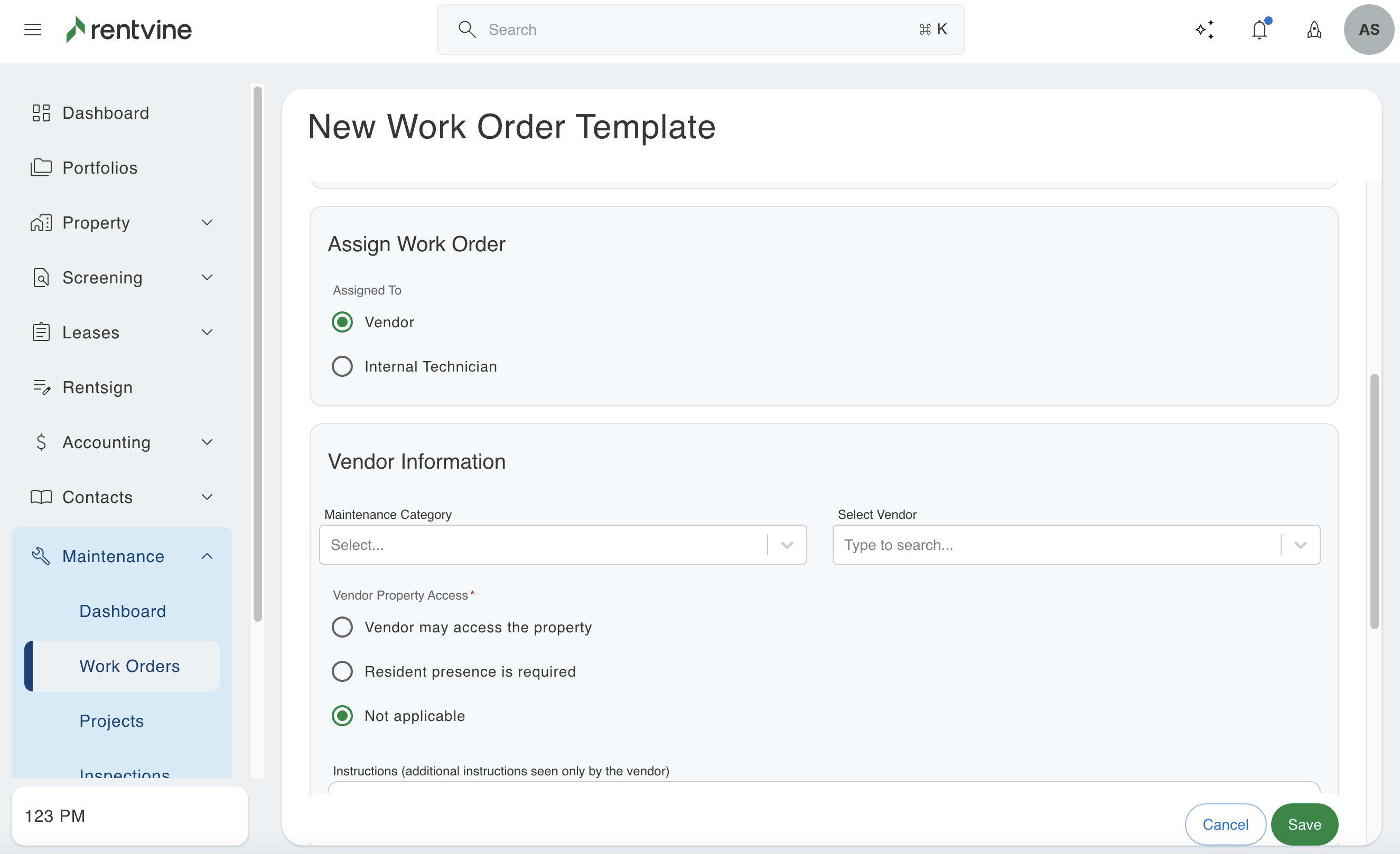 - Vendor Information (required) - Allows you to select a Maintenance Category, the specific Vendor, and whether this type of Work Order Template will require resident access or not