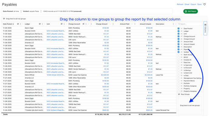 To group the report, click and drag the column into the row group section. This will group the report by the column you selected.
