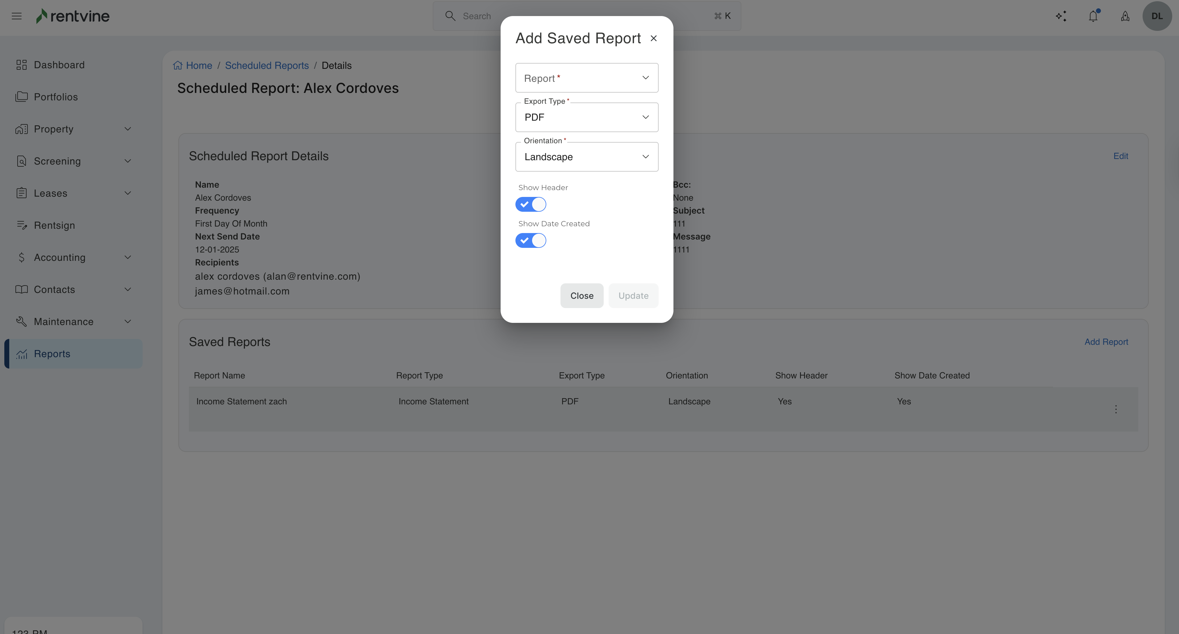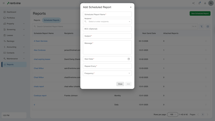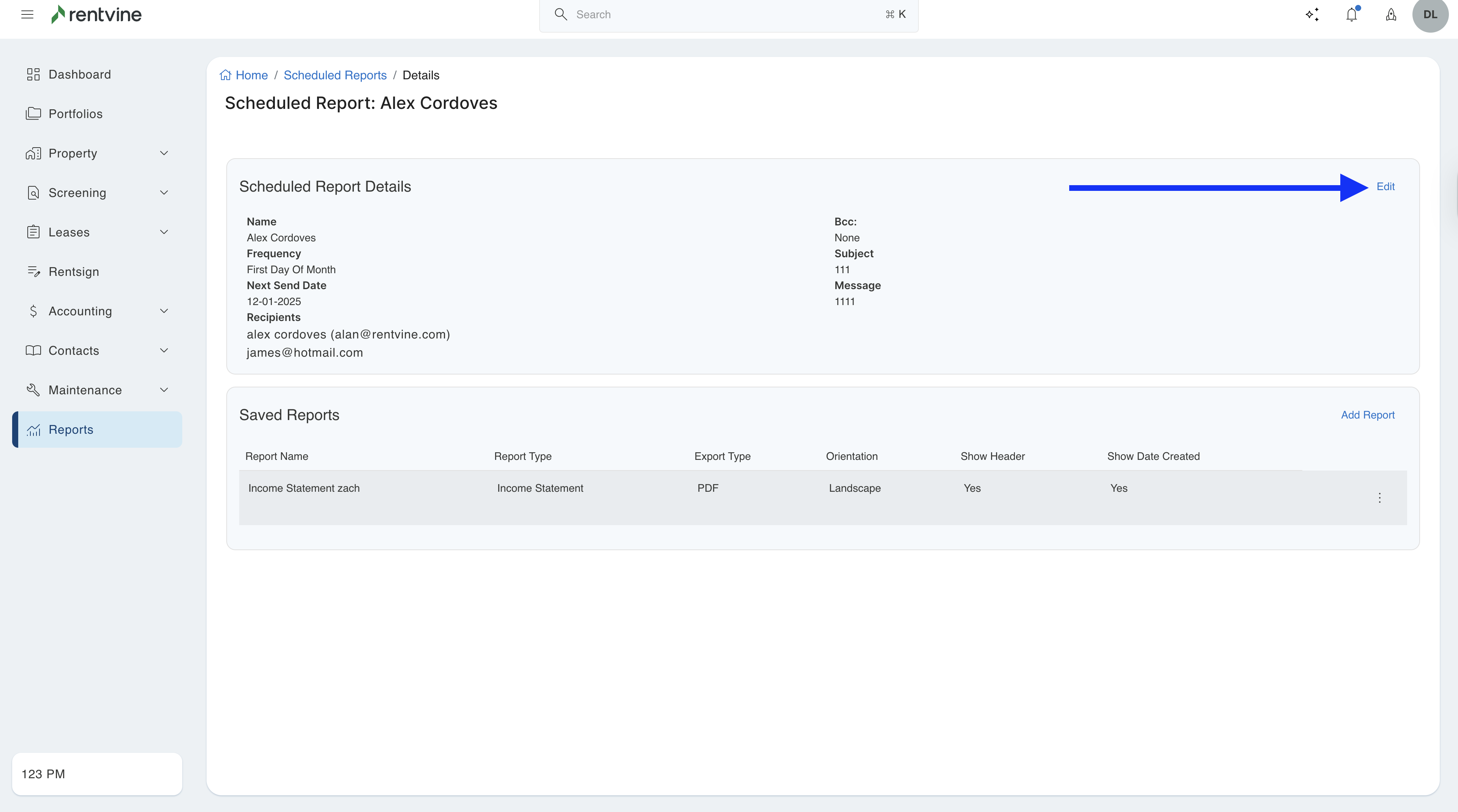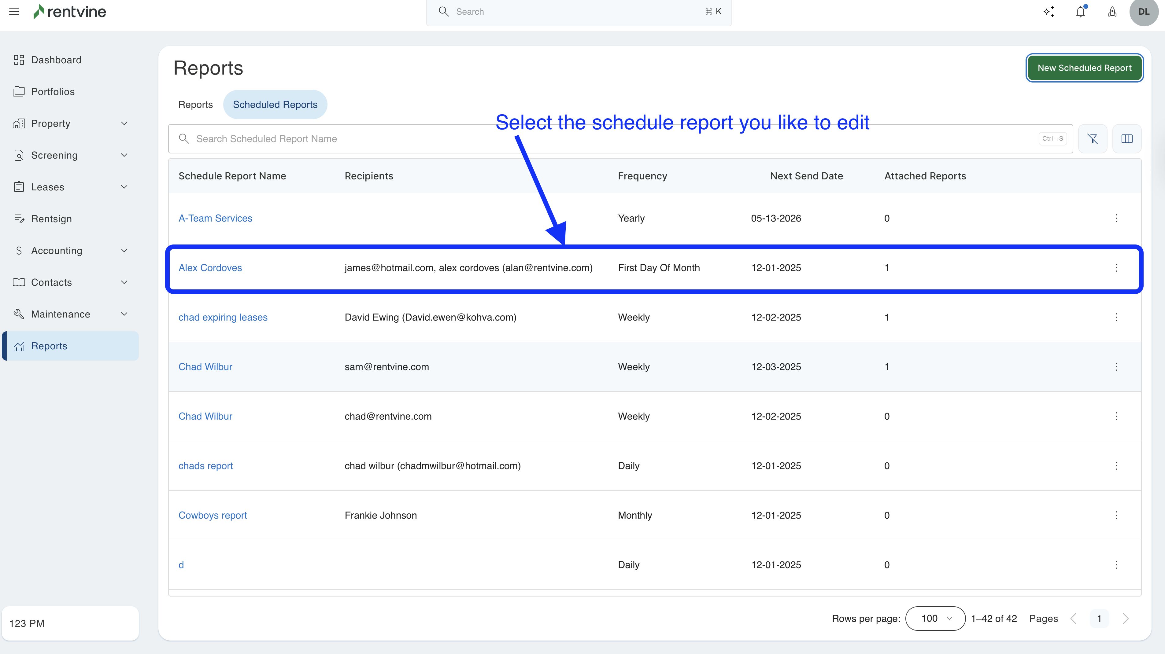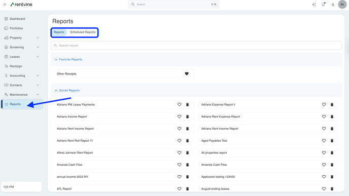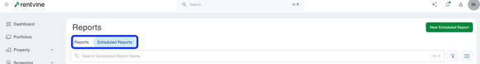 - Your scheduled report will now appear in the Scheduled Reports tab of the Reports section of your Rentvine account. If you ever want to delete this scheduled report or any other scheduled report, you can click the ellipses on the far right side of the report and click delete.
