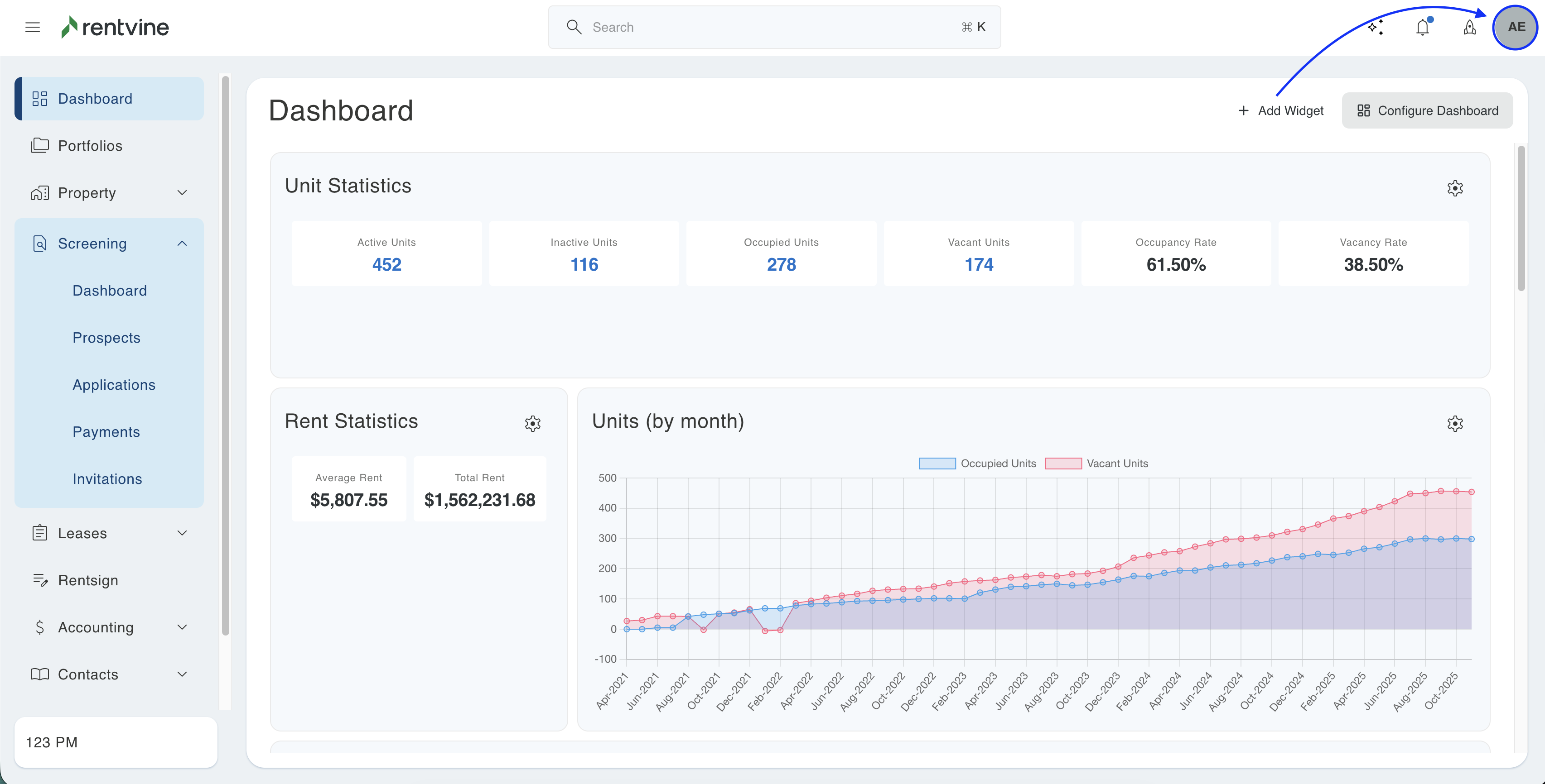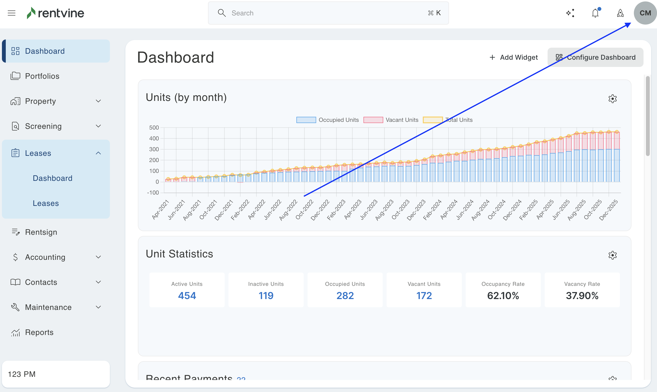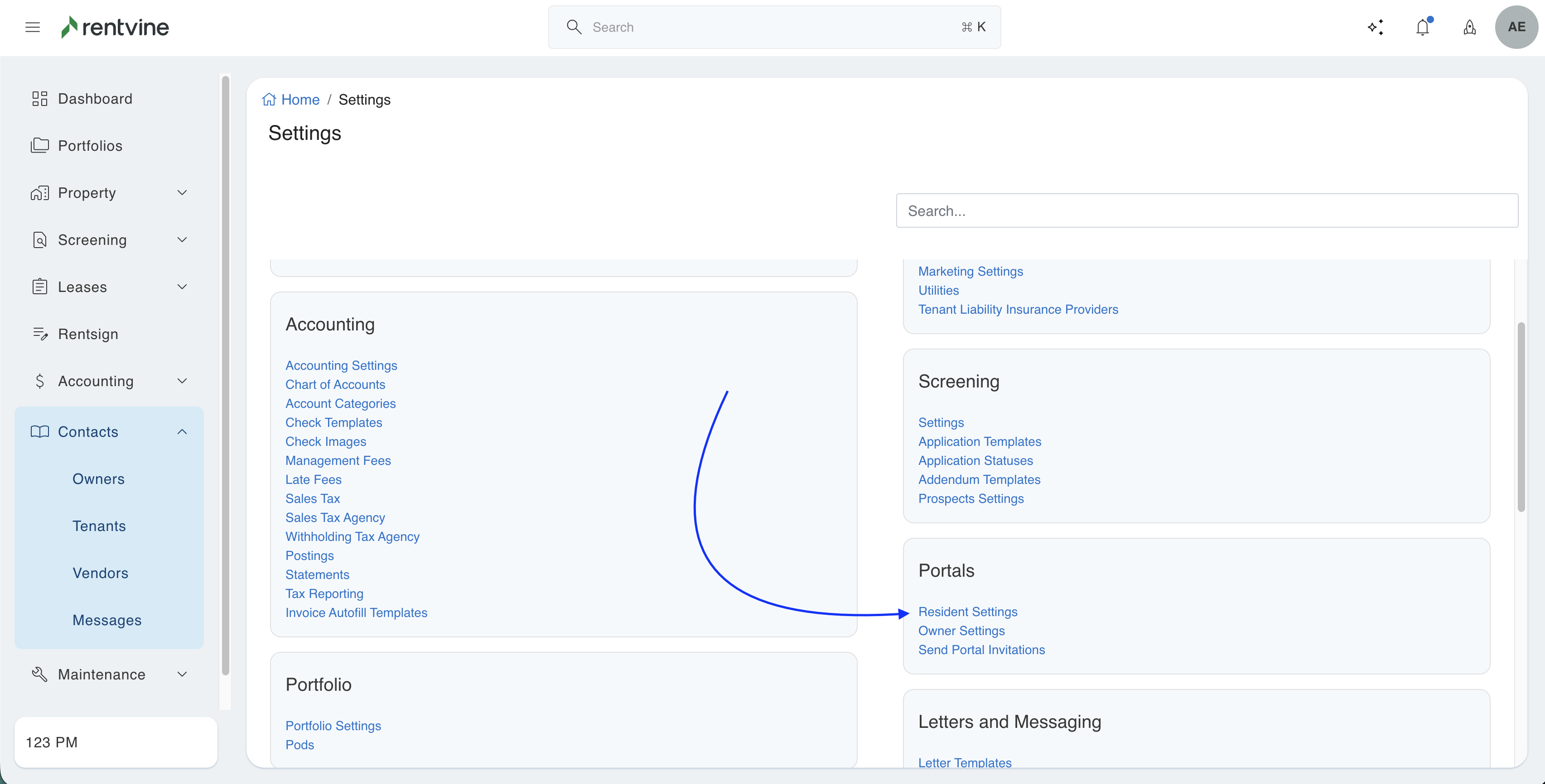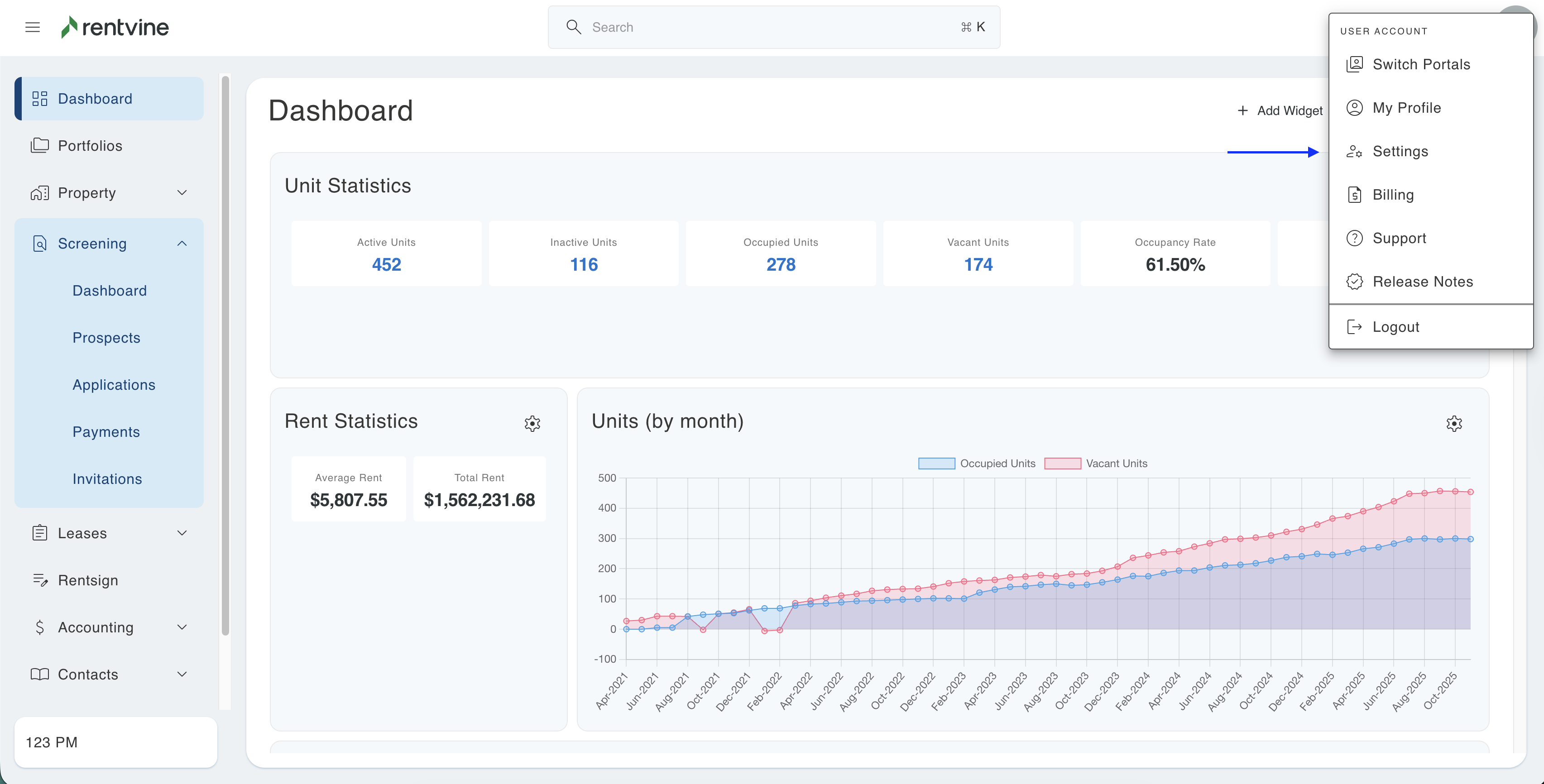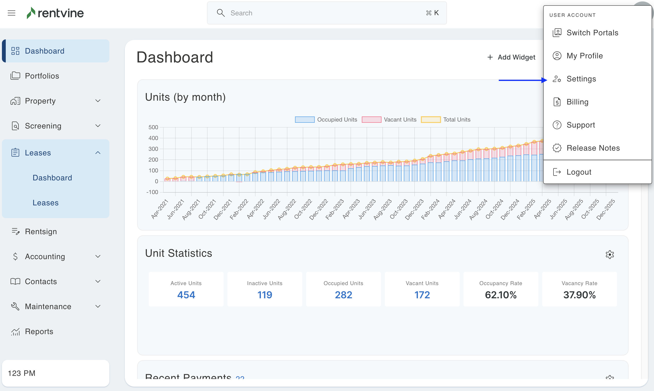 - First, on the Rentvine home screen, click on the ellipsis by your name and select Settings.