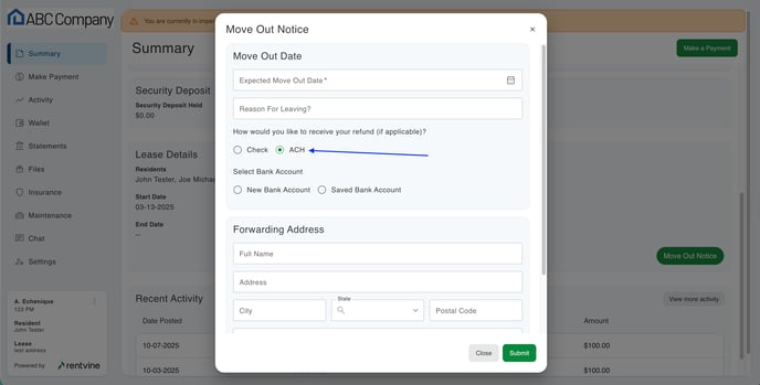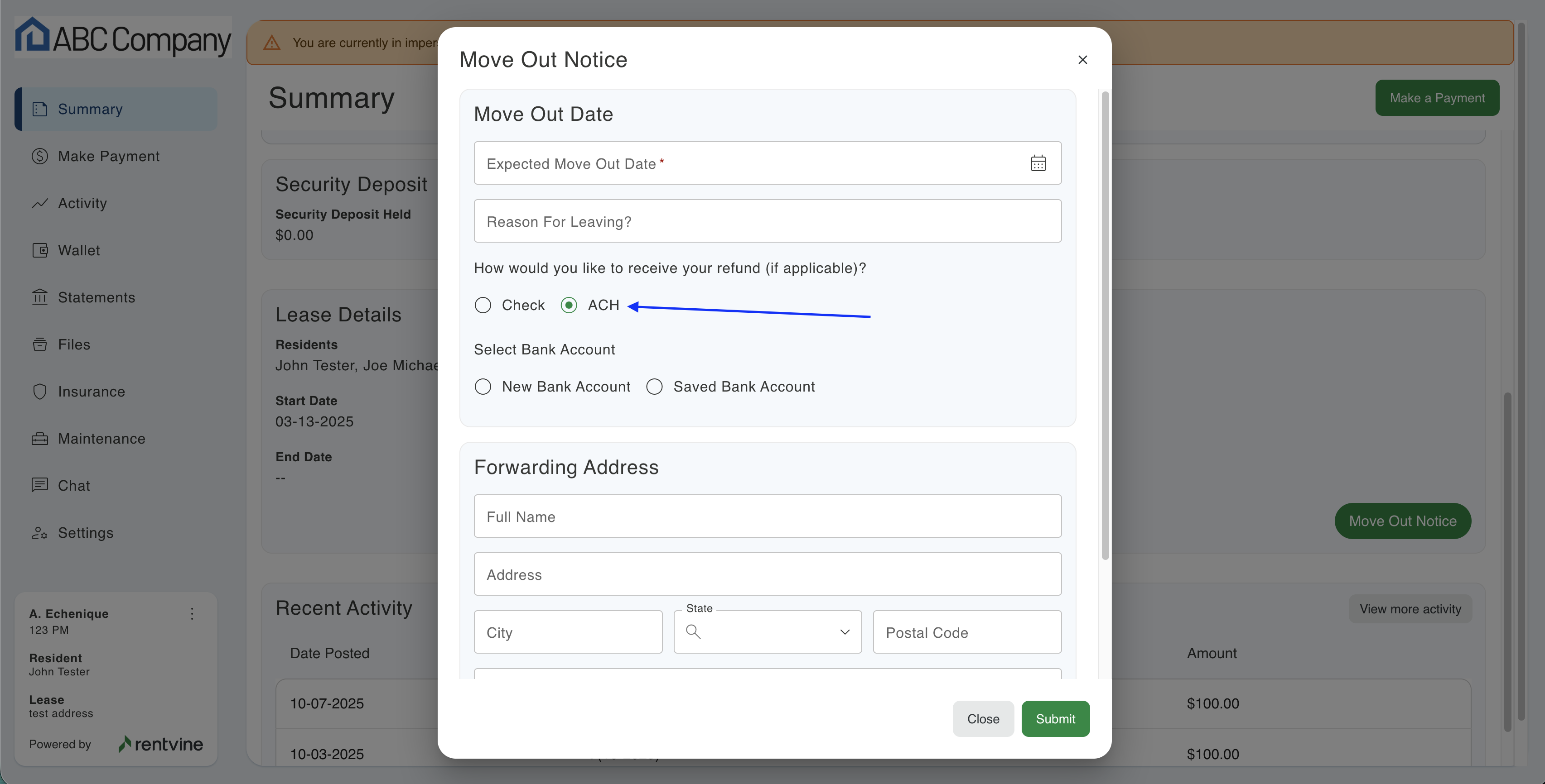 By default, in the system, when a tenant submits their move-out notice through their portal and selects their refund option, they are only able to choose a paper check. However, we can now activate or deactivate the option for ACH (ECheck) as a choice in the tenant portal.
