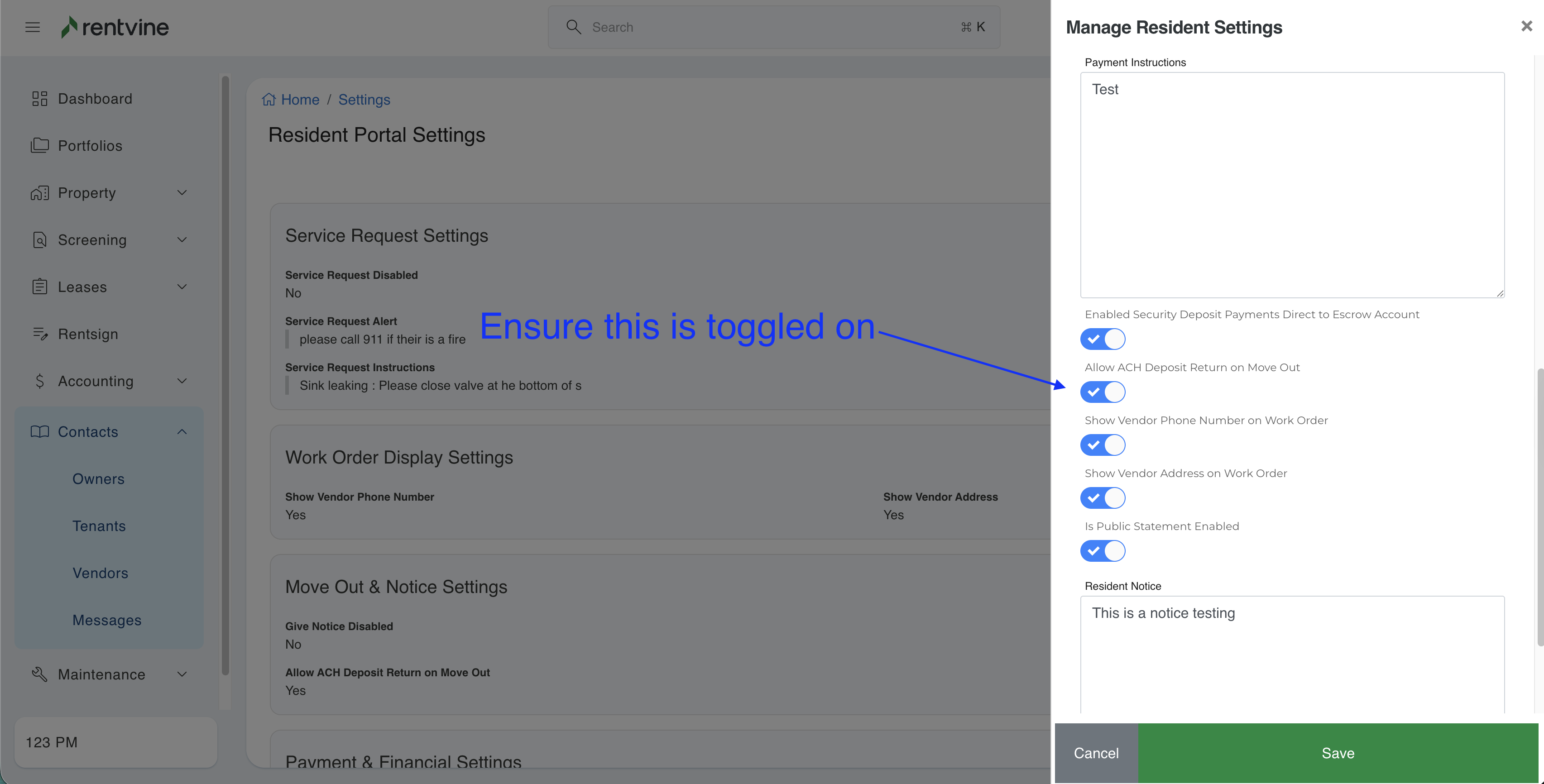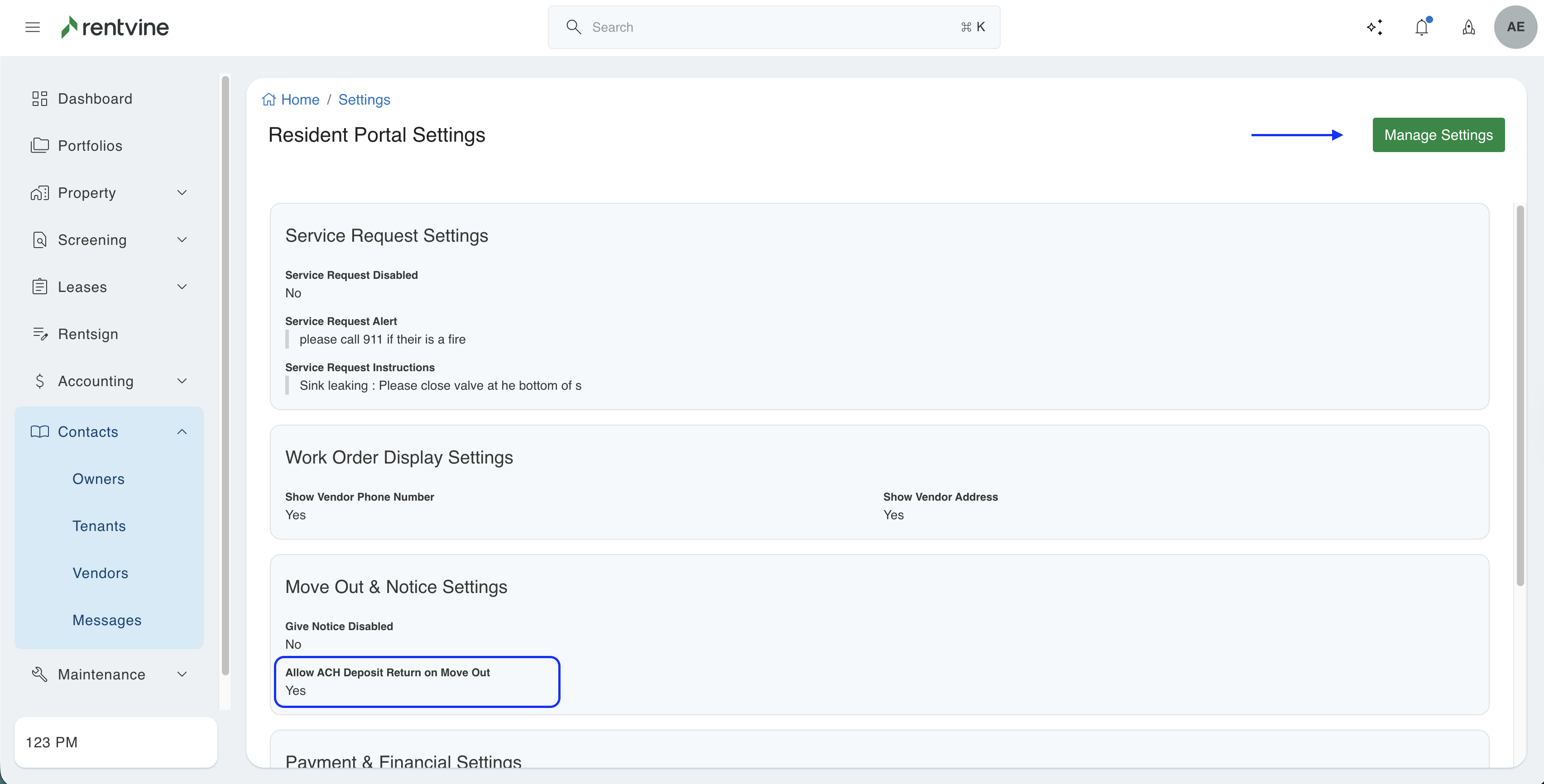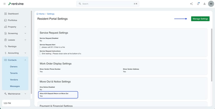 - On the settings page, you will notice a line item that says "Allow ACH Deposit Return on Move out." To go ahead and change this, let's click on Manage Settings on the top right of the screen.