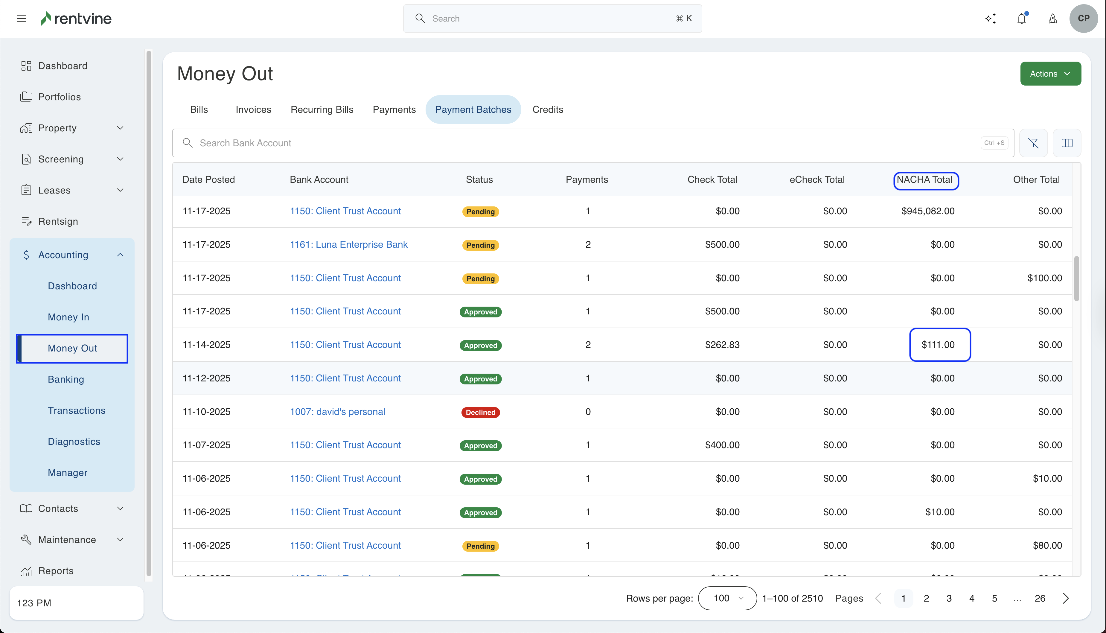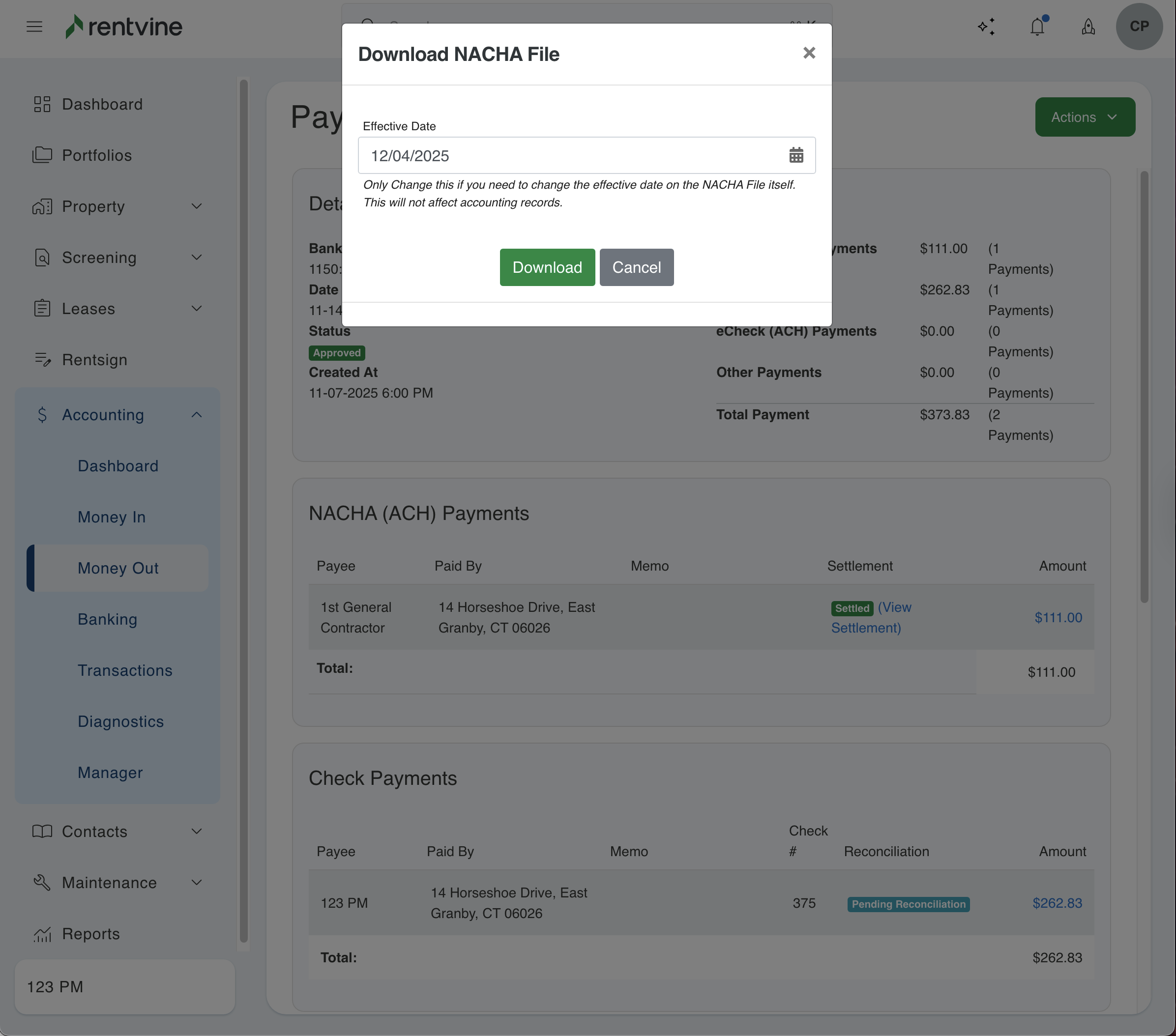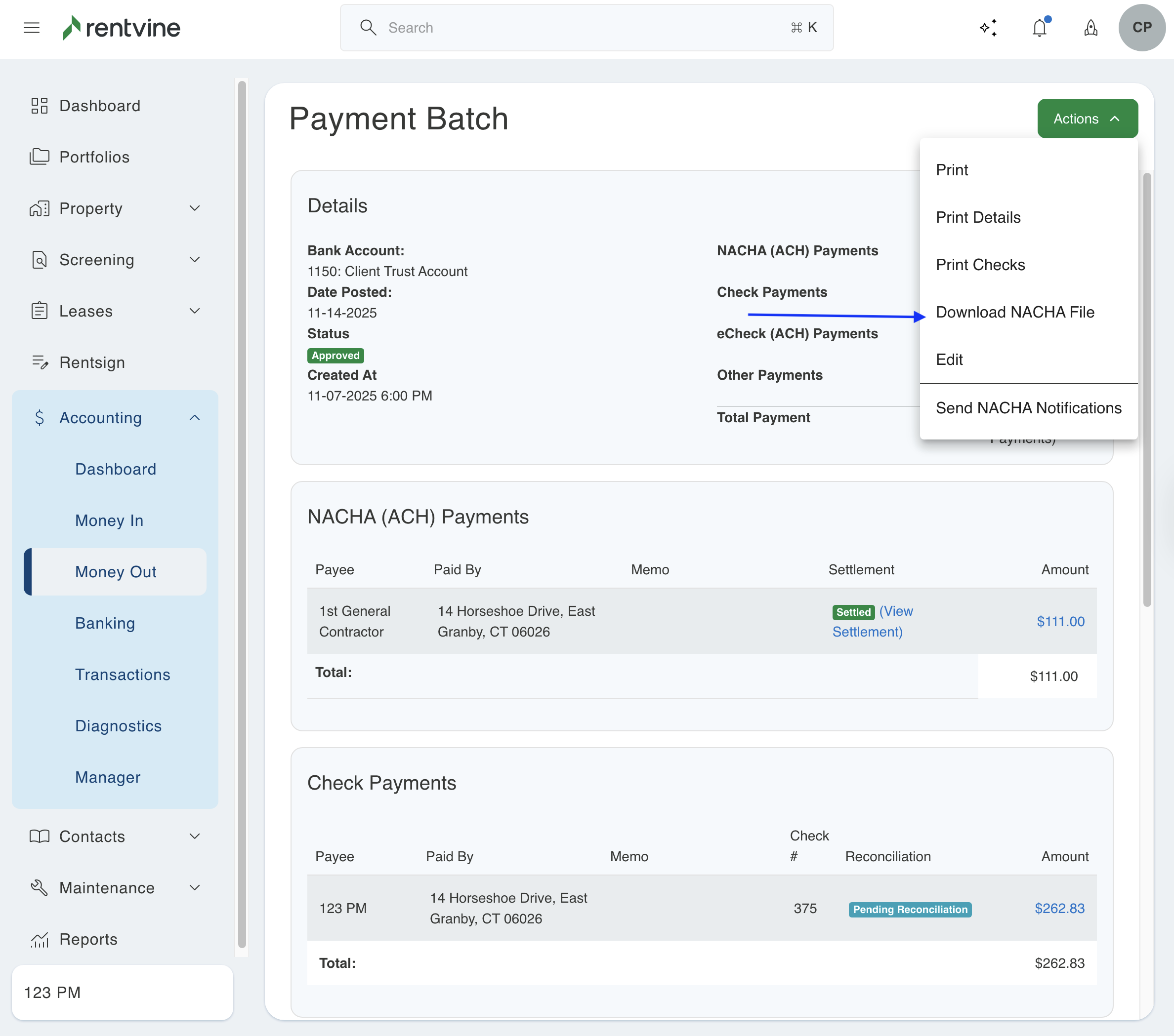 If you have made a payment in Rentvine where the payment method was NACHA File, this article will walk you through the steps of locating and downloading the NACHA file.