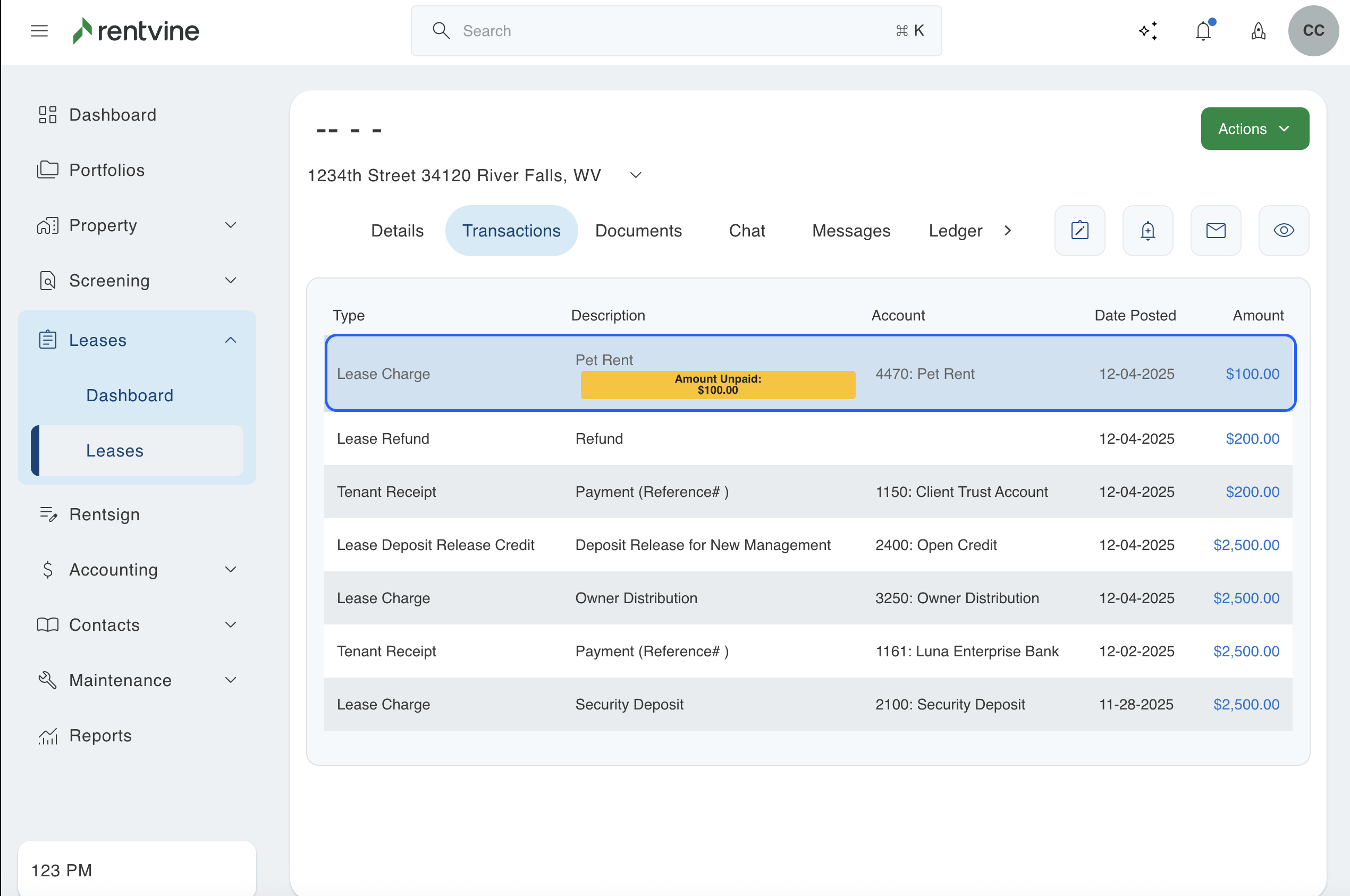 2. You will then click on the tab labeled "Transactions" at the top. This will pull up all of the transactions attached to this lease. You will then look for the lease charge you would like to edit and click the row.