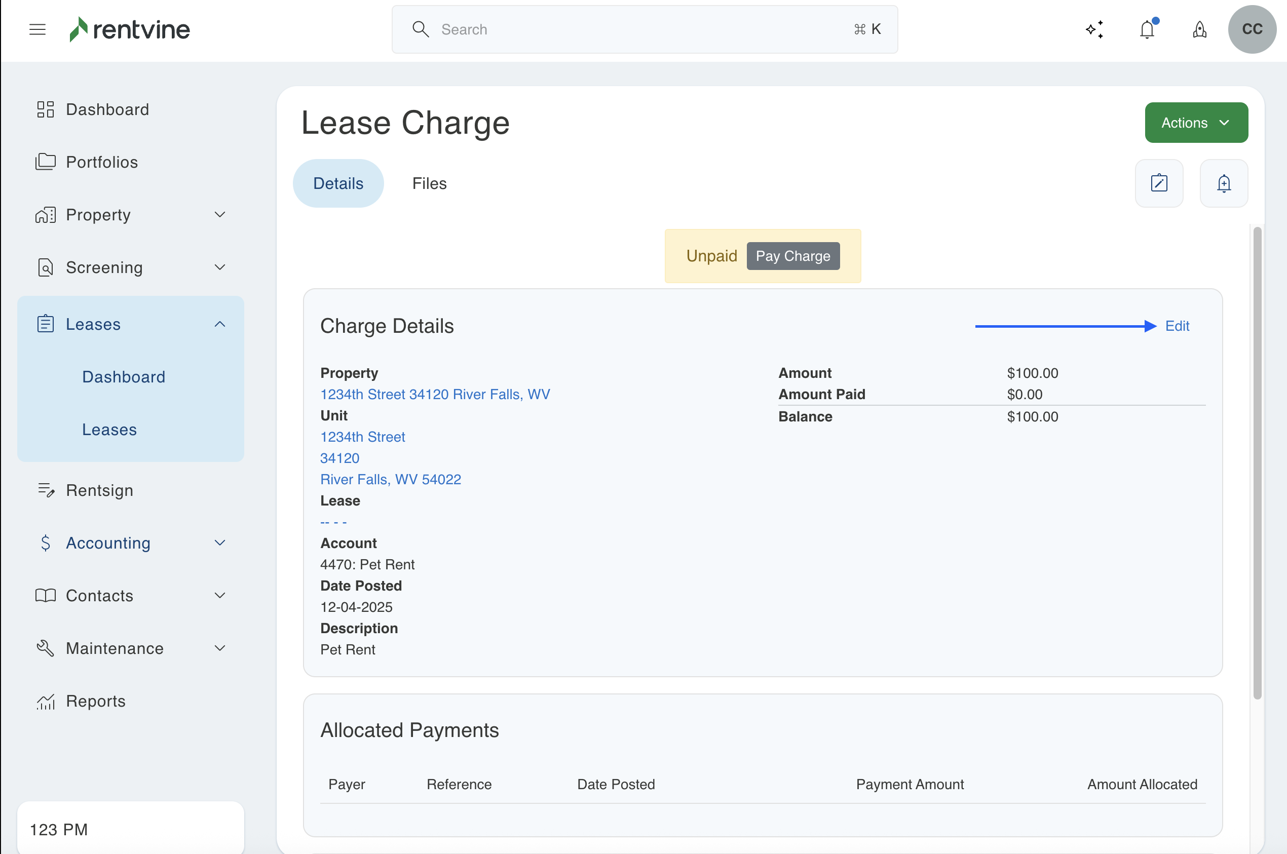 Do you need to edit the information of a lease charge? This article will show you how to edit a lease charge on any lease in Rentvine