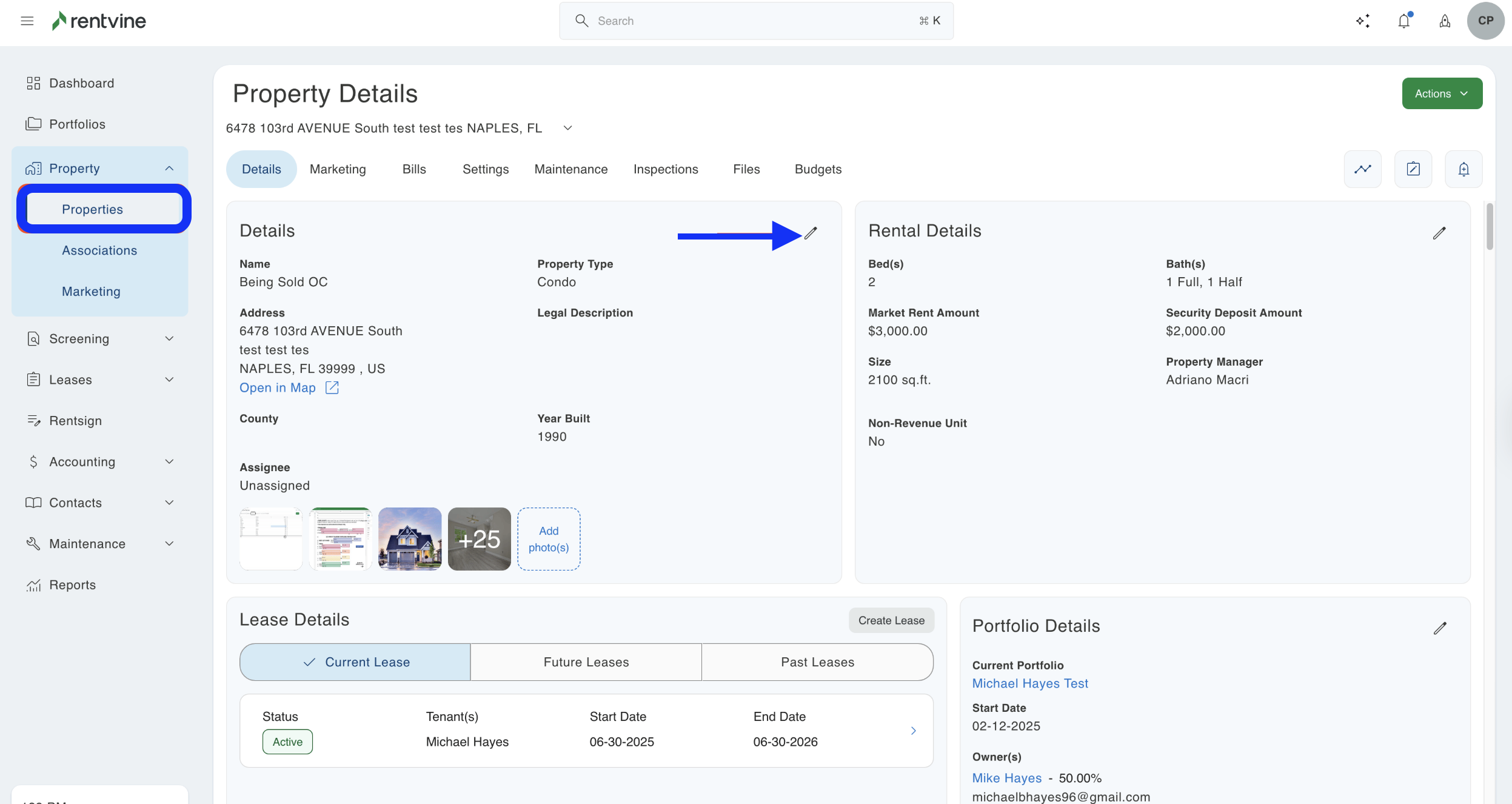- From the dashboard view of Rentvine, click on the Property dropdown on the left-hand side