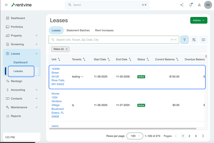 1. Click on the tab labeled "Leases" on the left side of the screen. This will pull up a list of all the leases you have.