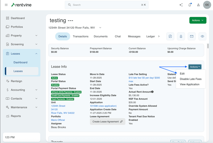 3. Stay in the tab labeled "Details". You will then look for a box labeled "Lease Info". In the top right of this box, click the blue actions button, then click the edit button to pull up fillable fields you can change.