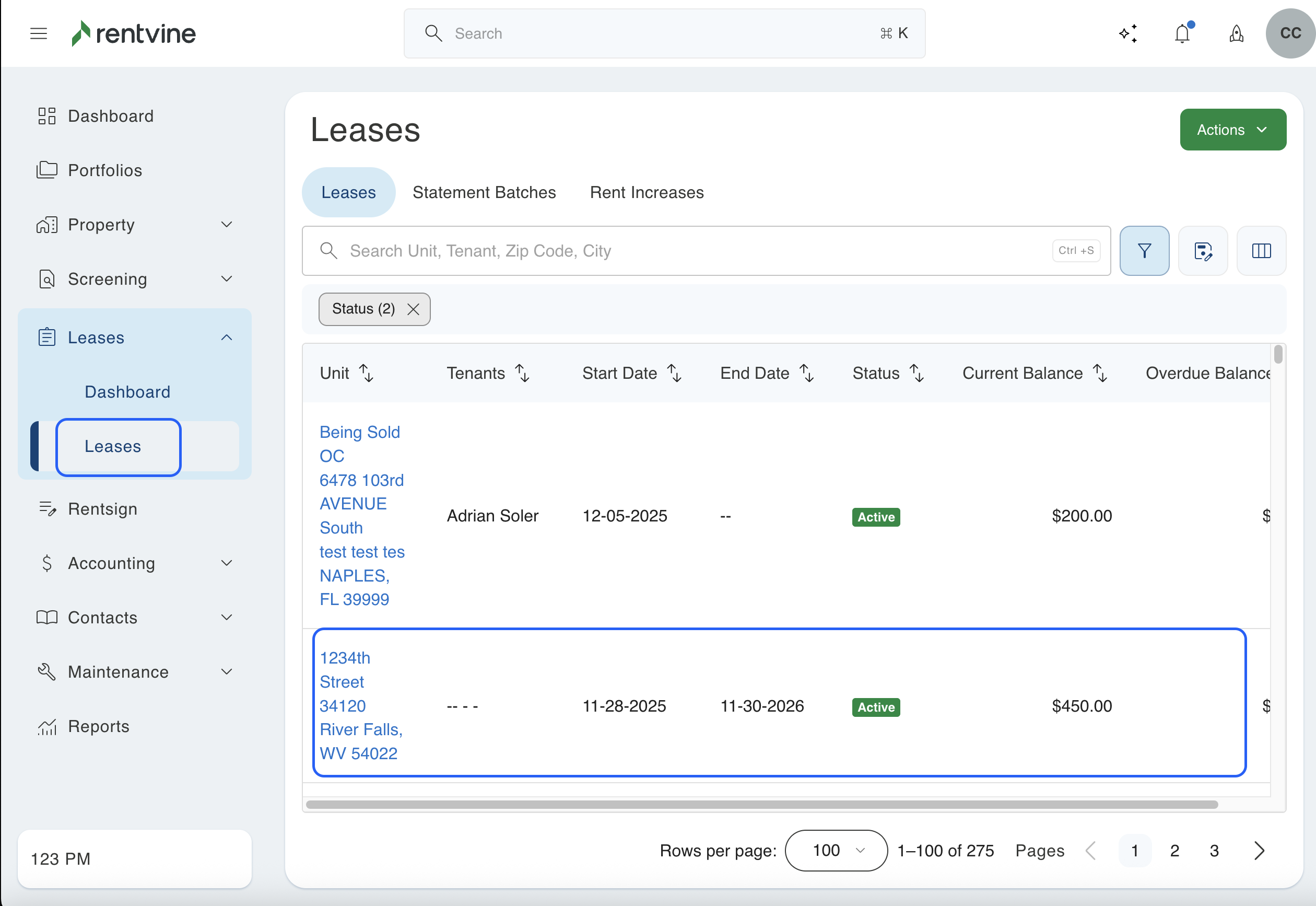 2. Next, you will search for the specific lease you want to edit the renter's insurance for. You will then click on that property to pull up the lease.