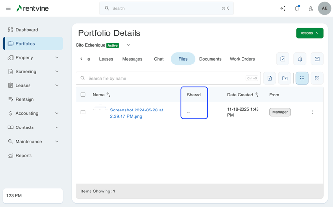 - In the Files section, you will notice that any file that is not shared with the owner will have ‘----’ under the ‘Shared’ column