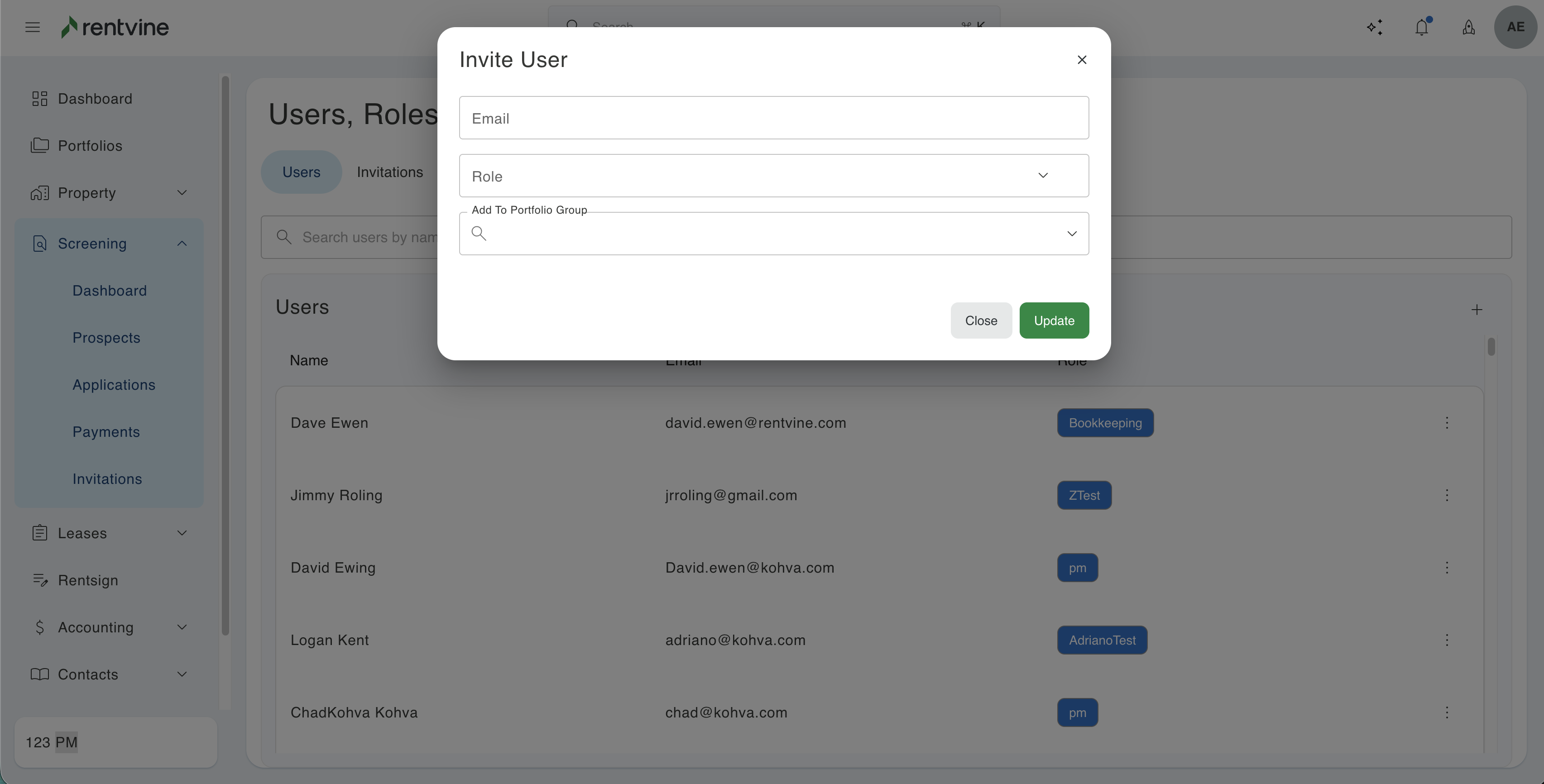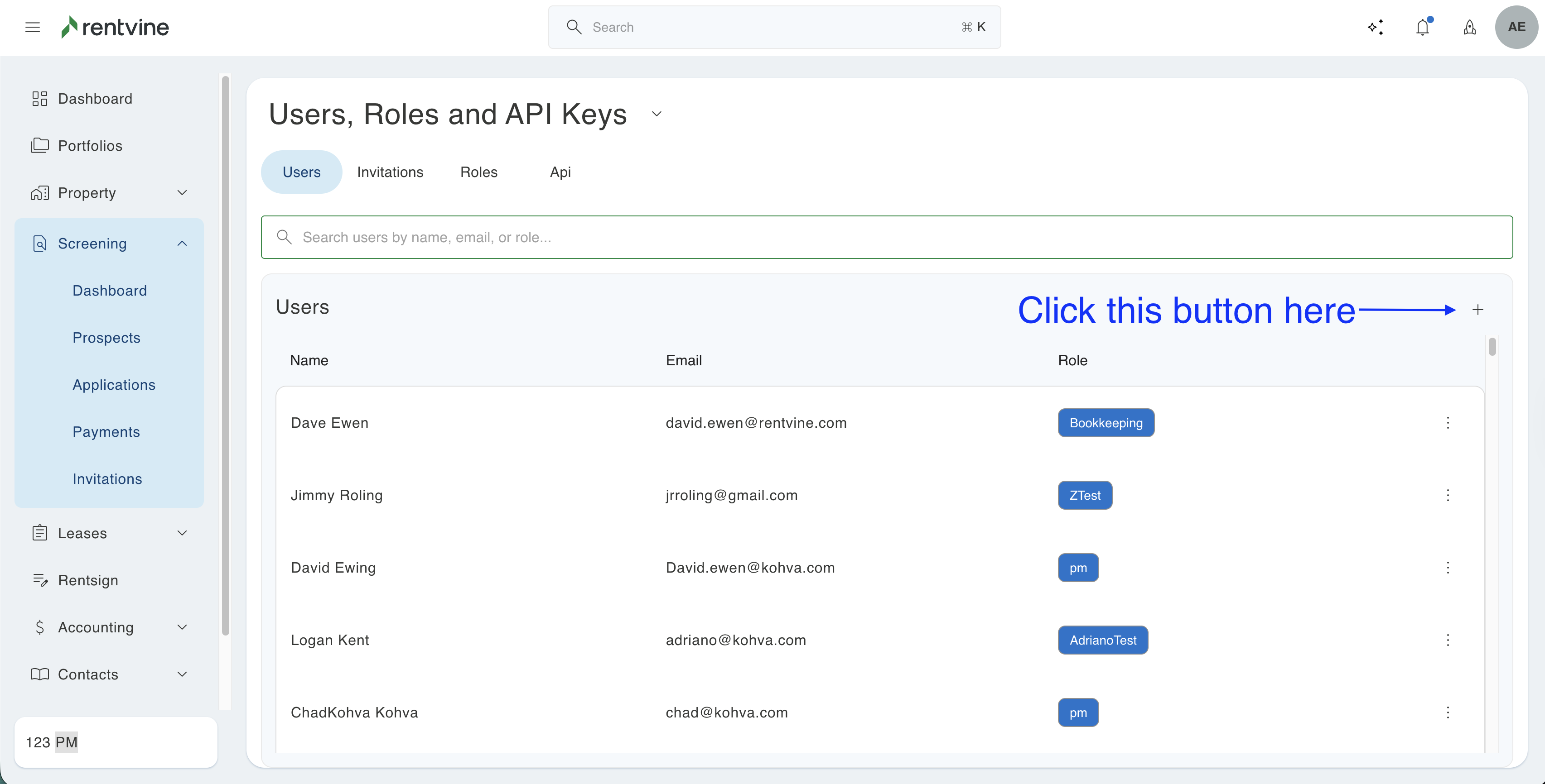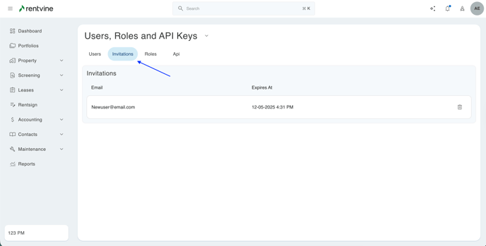 This article will guide you through the process of inviting a user to your Rentvine account. They will be listed under your user section in Rentvine under your global settings/user/role/API Key section.