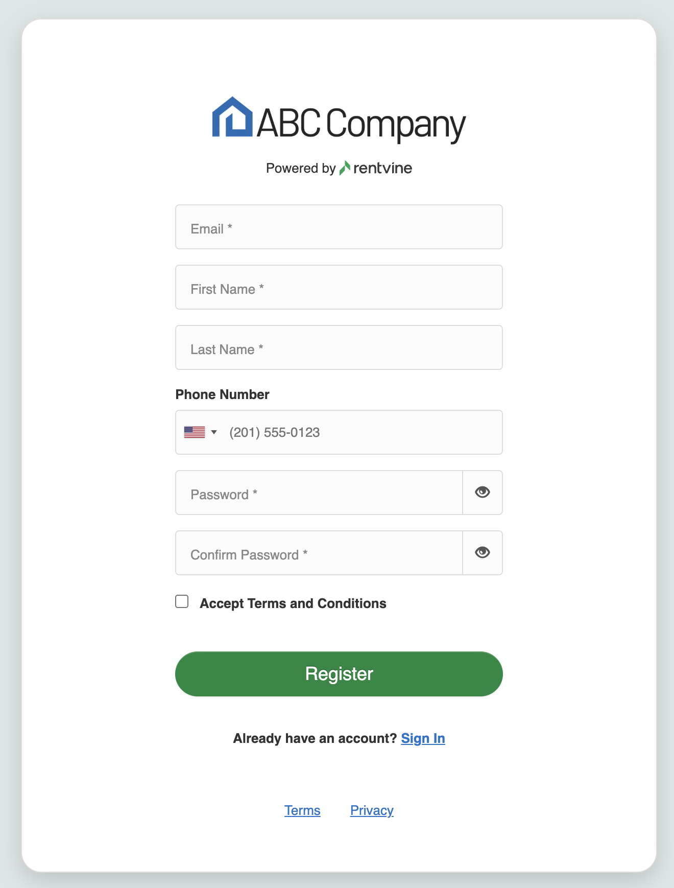 They will be asked to register and fill out the details below. Once they fill out the details below, they will hit the REGISTER button at the bottom of the page. They are now a registered user in Rentvine.