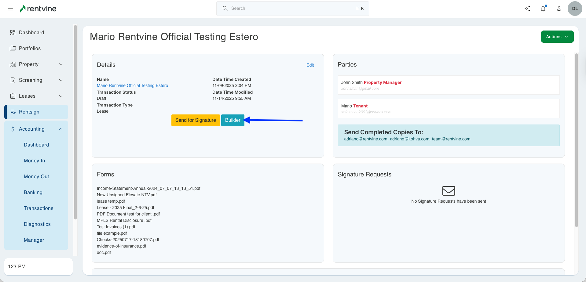 - To get started, you will need to go to the Rentsign tab. In here, you can create a new Rentsign document or view documents that have yet to be sent out. For this example, we will click into an existing Rentsign document that has not been sent for signatures. In here, you will need to click on the "Builder" button.