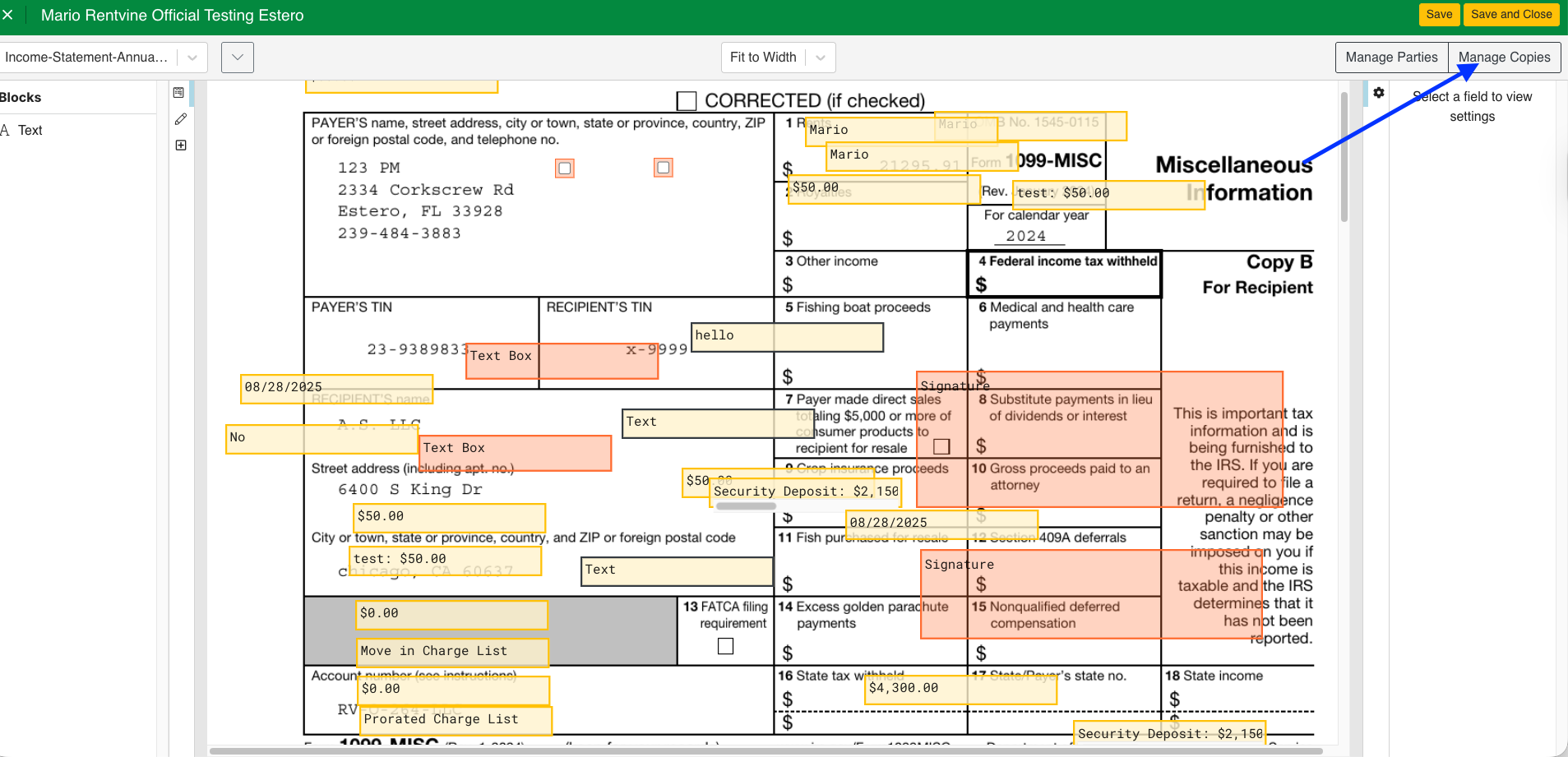 - In the builder of the document, you will see a button to "Manage Copies". If you click on this, you can add an email address to which the signed copy will be sent. You can add as many emails in this section as you need. This will work similarly to a CC, where the parties attached to the document will receive the signed document, as well as the people listed in the manage copies field.