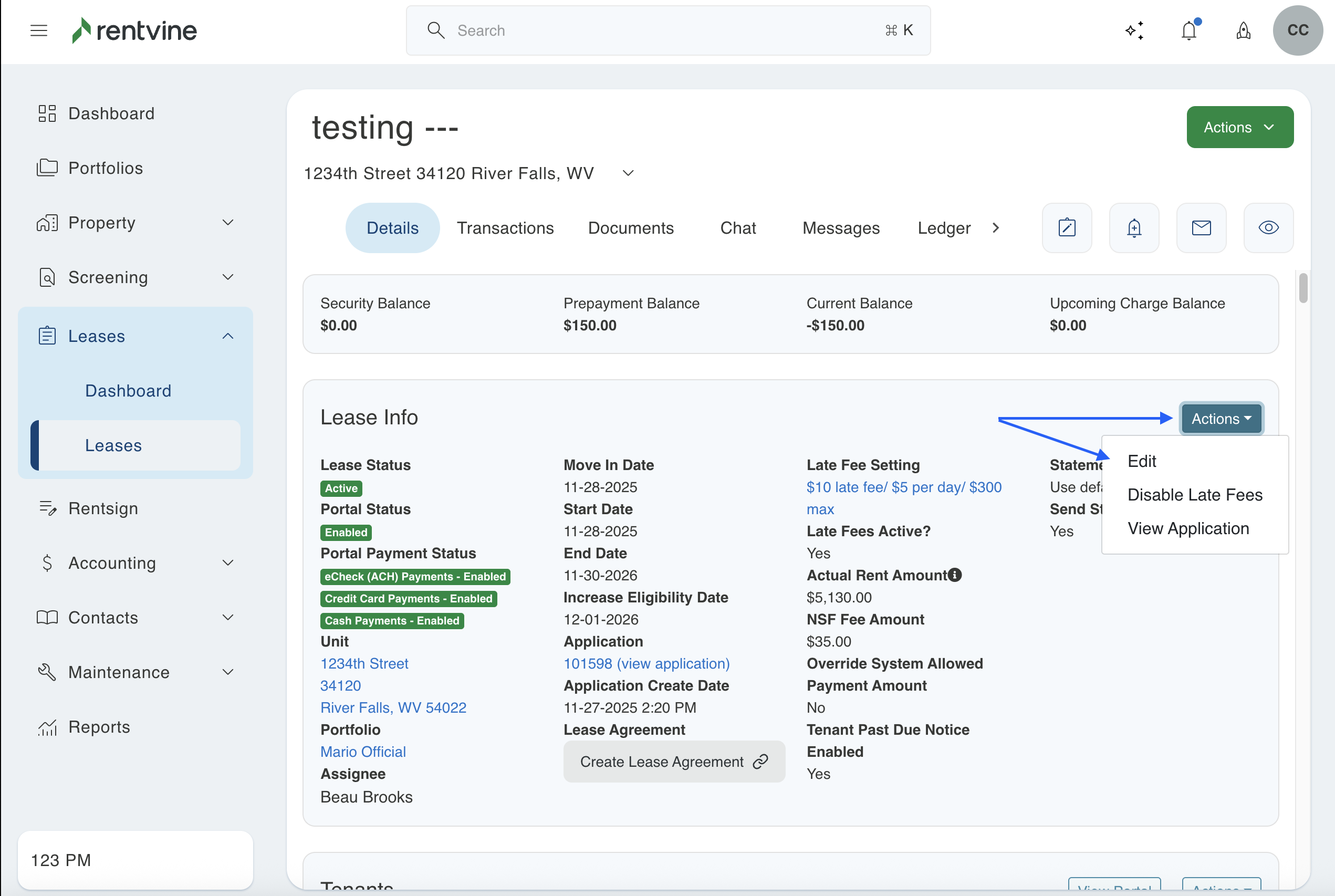 3. Stay in the tab labeled "Details". You will then look for a box labeled "Lease Info". In the top right of this box, click the blue actions button, then click the edit button to pull up fillable fields you can change.