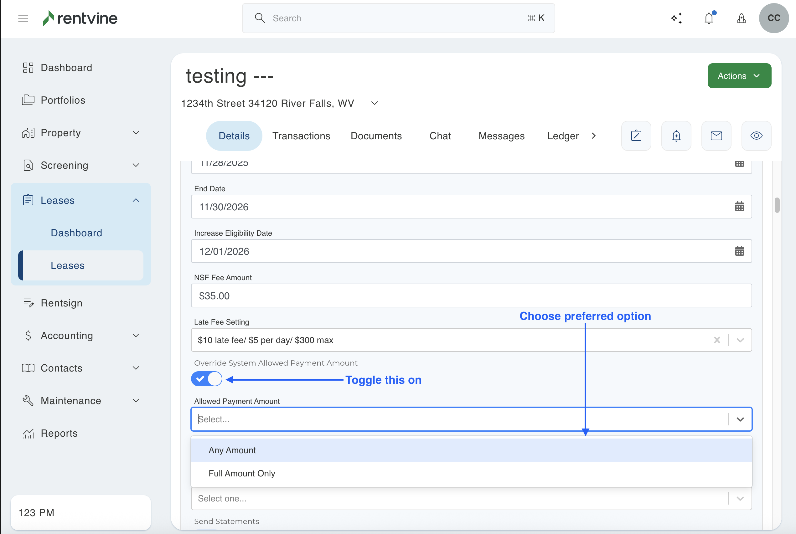 Do you want to change if a tenant can either pay the full amount of charges or any amount? This article will show you how to override the default allowed payment amount on any lease in Rentvine