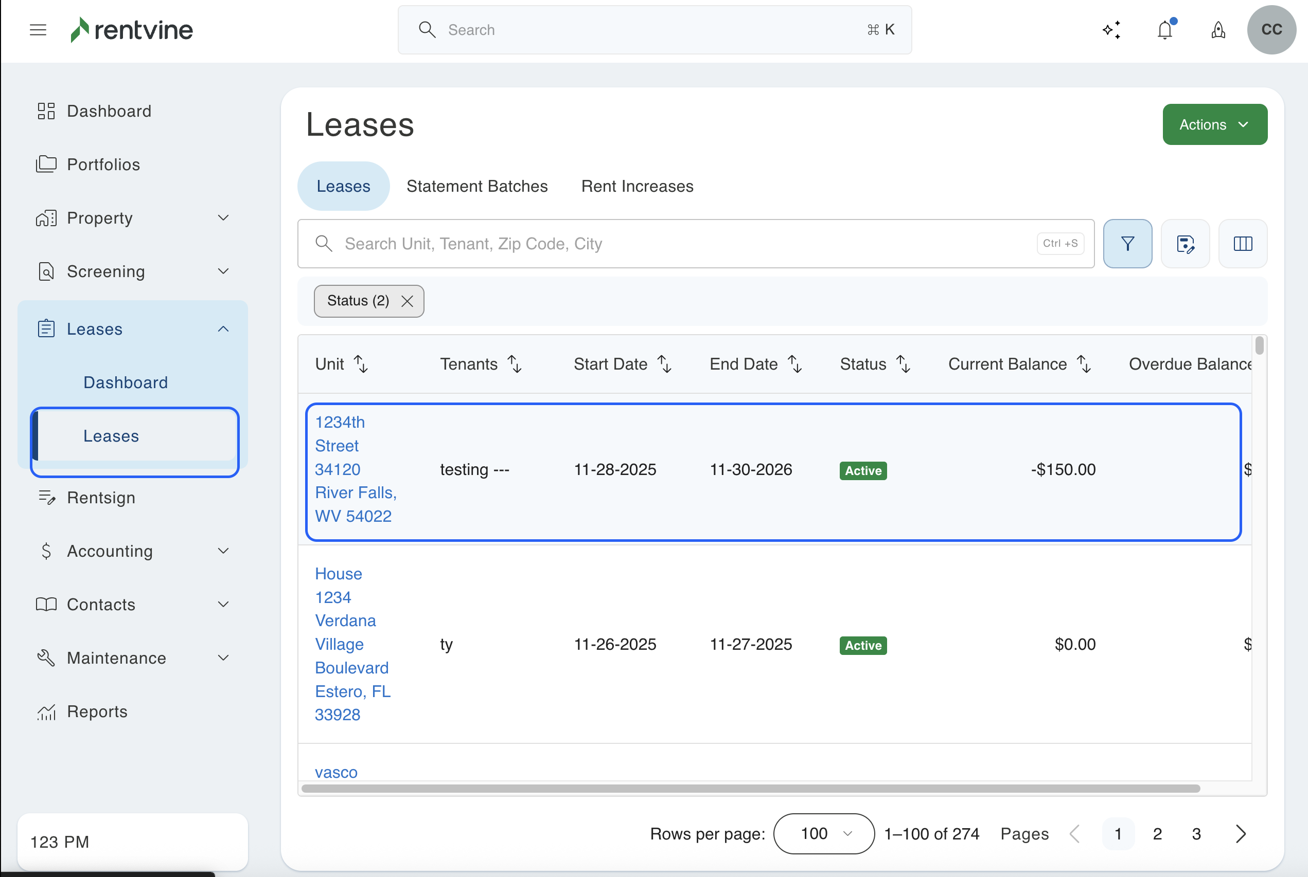 2. Next, you will search for the specific lease you want to print. You will then click on that property to pull up the lease.