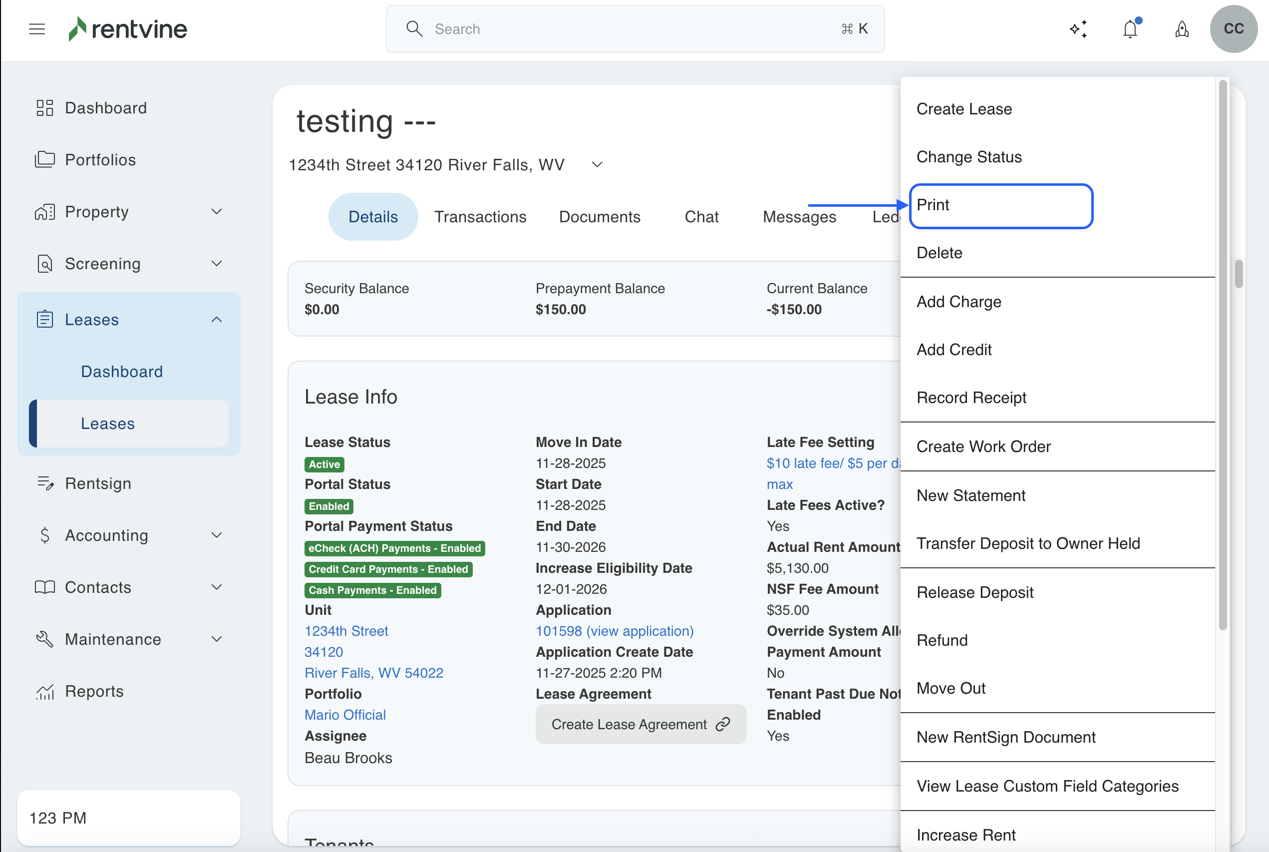 3. This will bring up the lease, and you will click the green actions button in the top right. In that menu, you will press print. This will bring up a print preview with all the details about the lease that you can print off.