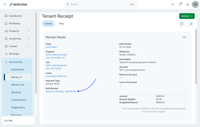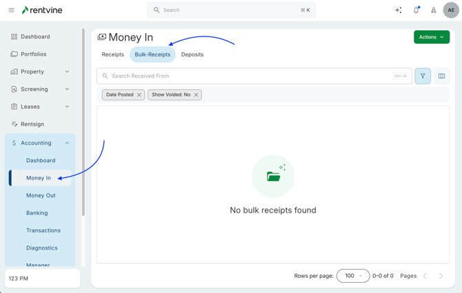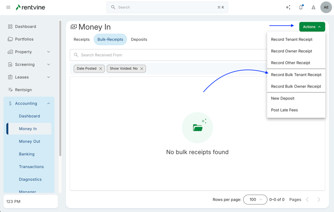 - From here, you will click the Actions button -> and select Record Bulk Tenant Receipts
