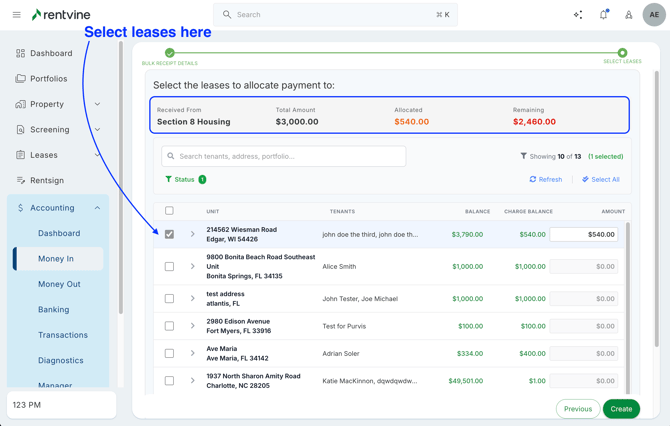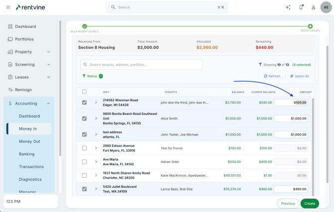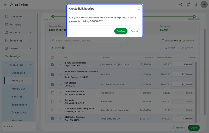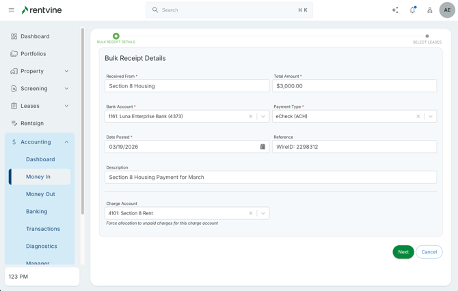 Rentvine allows you to easily record these types of payments using Bulk Tenant Receipts, then apply them to the correct tenants, leases, and charges.