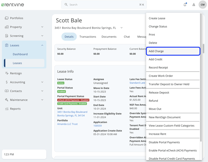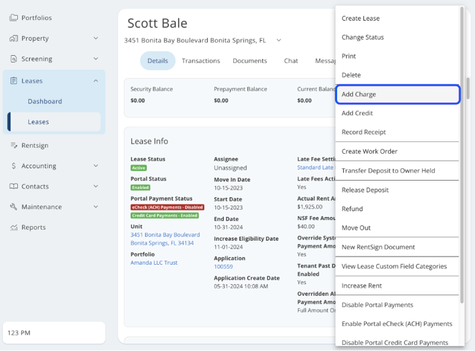 - On the lease, use the green actions button "add charge". Use your normal security deposit chart of account.