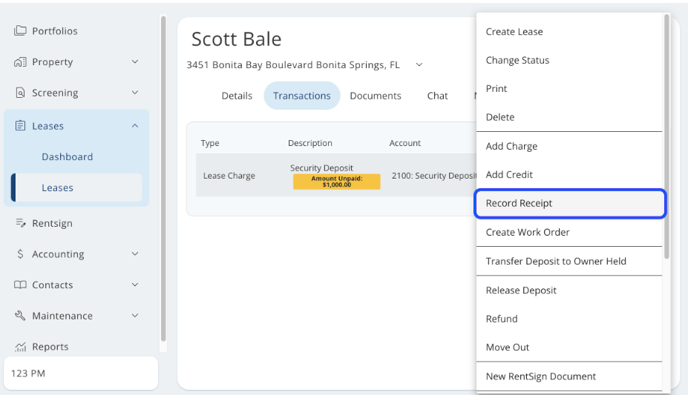 - The tenant can record a receipt via the portal by submitting an eCheck or Credit Card payment, or the property manager can manually record the receipt (check, cash, money order