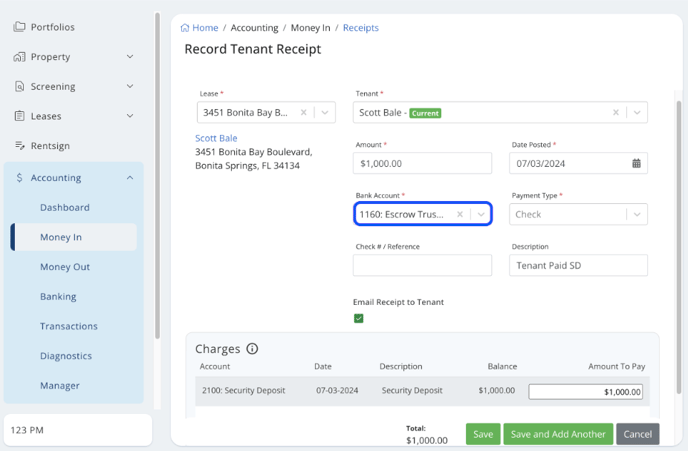 If you are manually recording this payment and have a separate bank account that holds Security Deposits, change the bank account from Auto to Your Security Deposit Bank Account.